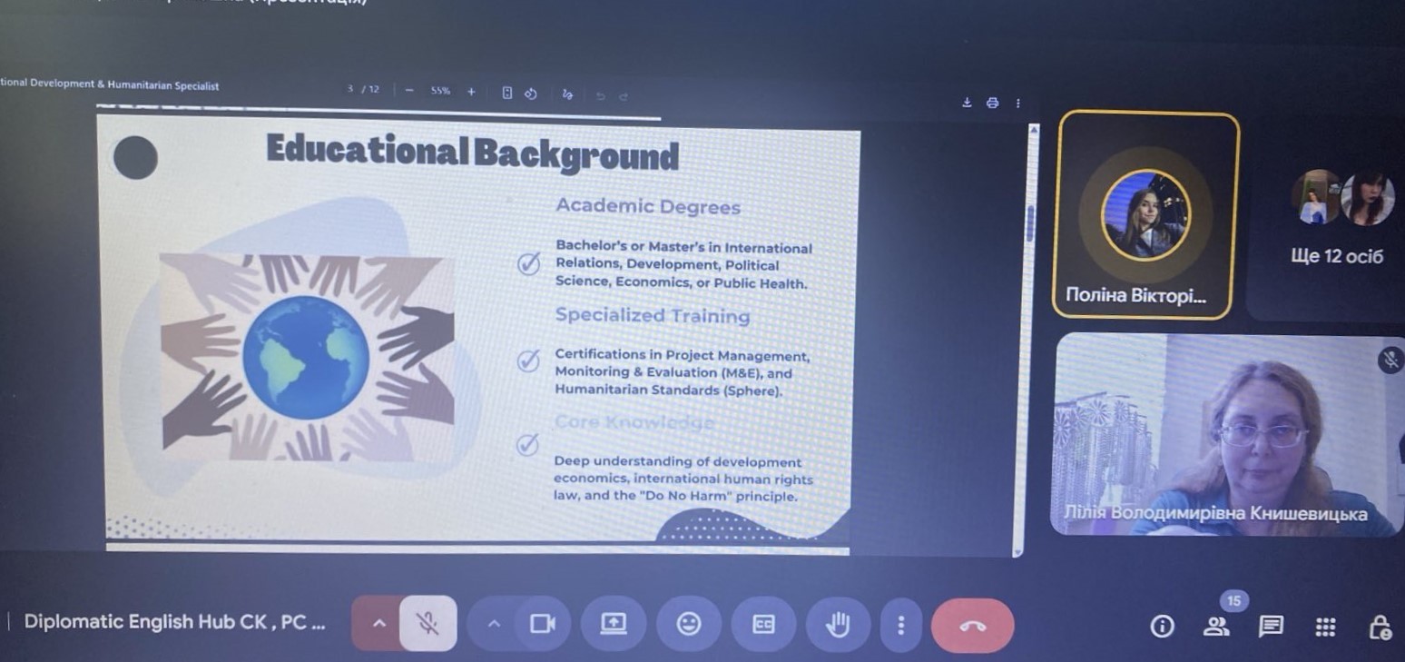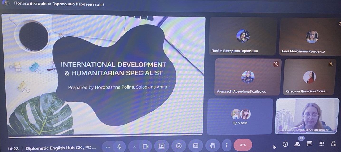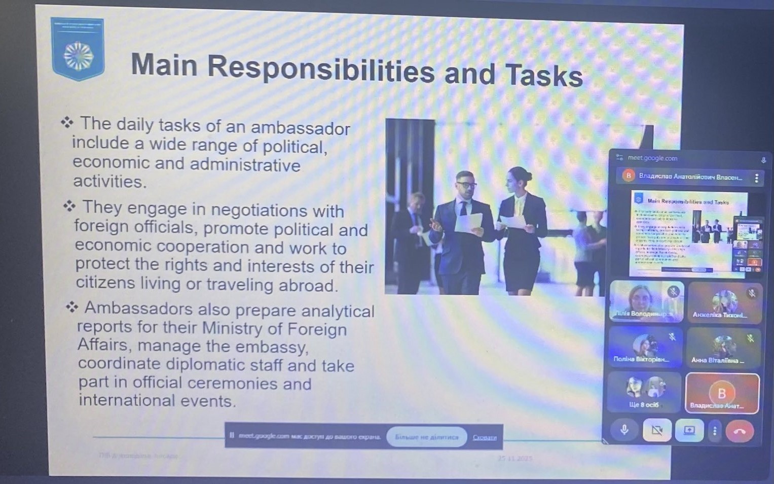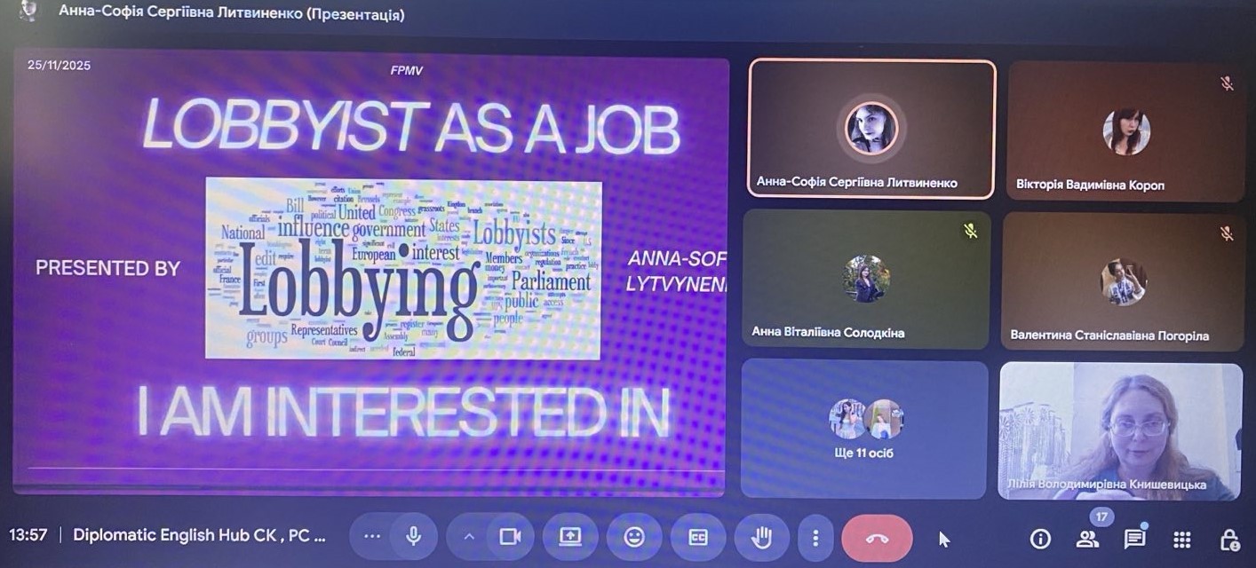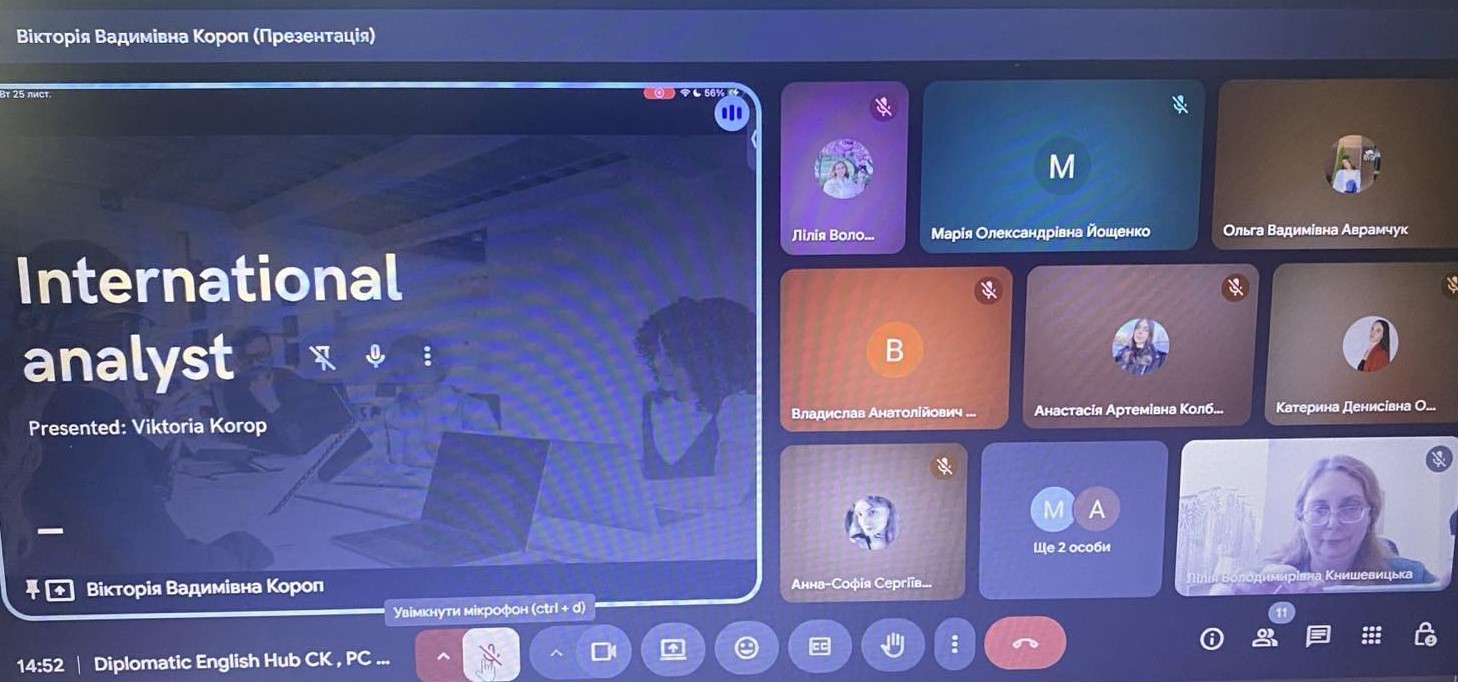 25 листопада 2025 року в онлайн-форматі відбулось засідання науково- практичного кружка «Diplomatic English Hub» зі студентами другого курсу ОП «Суспільні комунікації» та «Регіональні студії». Мова спілкування- англійська. Тема засідання «Професії в дипломатії, міжнародних відносинах та зв’язках з громадськістю». Модерувала зустріч старший викладач кафедри іноземних мов Книшевицька Лілія Володимирівна.