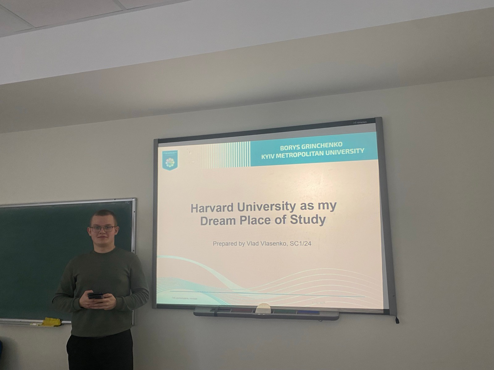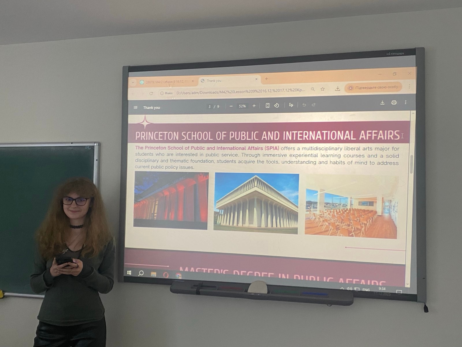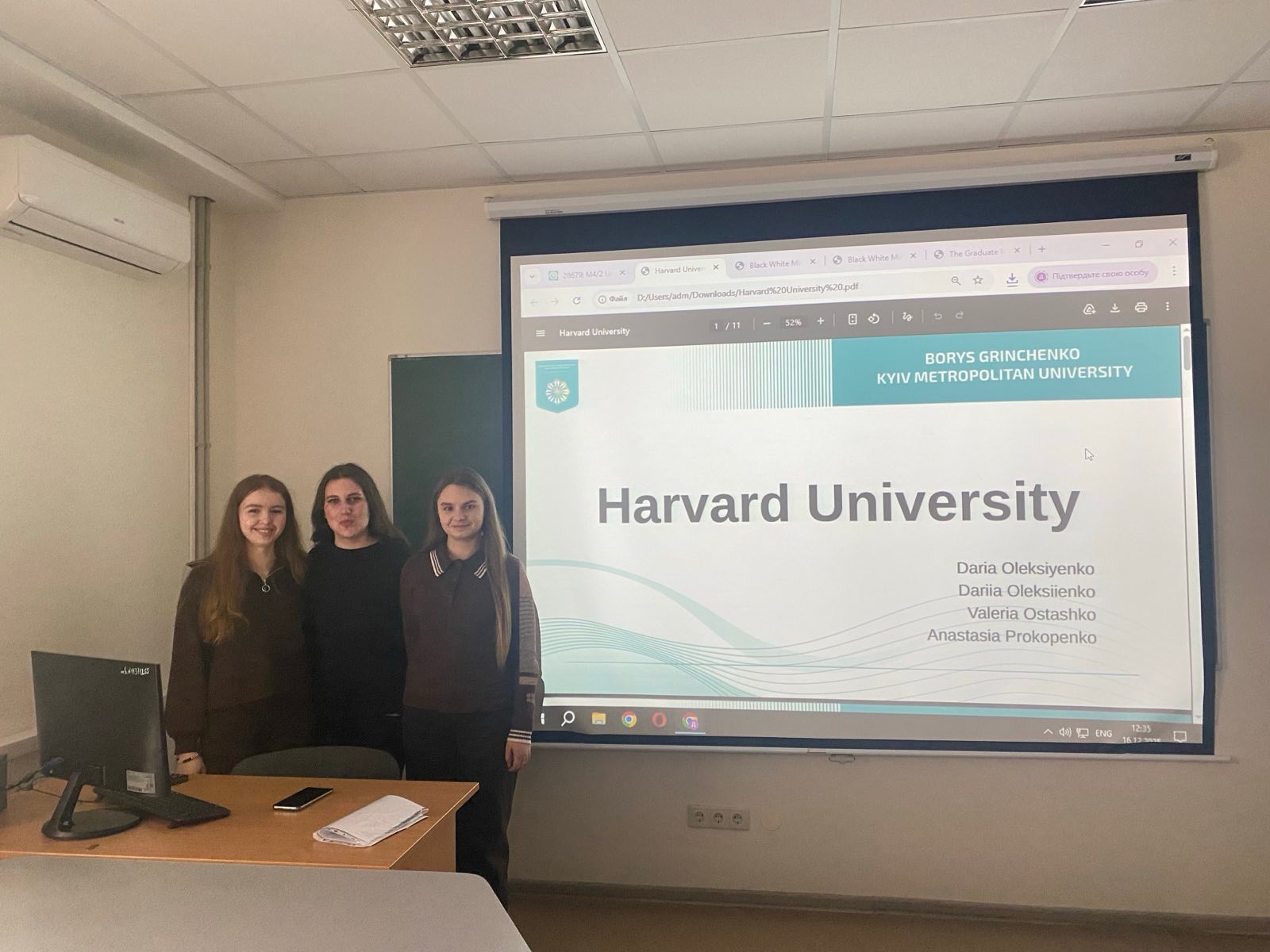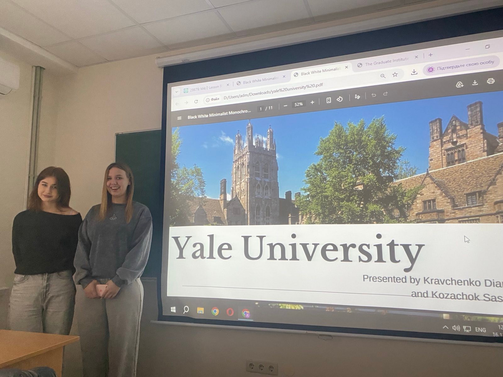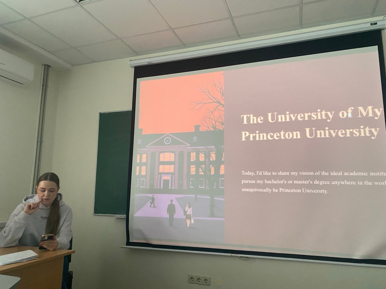 На заняттях студенти познайомились з історією та структурами вишів світу, найвідомішими та найвпливовішими університетами англомовного світу Оксфордом, Кембриджом, з американськими університетами Ліги плюща Гарвардом, Прінстоном, Єльським університетом, університетом Пенсильванії, Колумбійським університетом та іншими. Подивились англійською мовою частину фільму «А beautiful mind» («Ігри розуму») , якій розказую історію створення Джоном Нешем теорії еквілібріума і показує університет Прінстона та деталі життя і наукової діяльності студентів –докторантів в ньому.