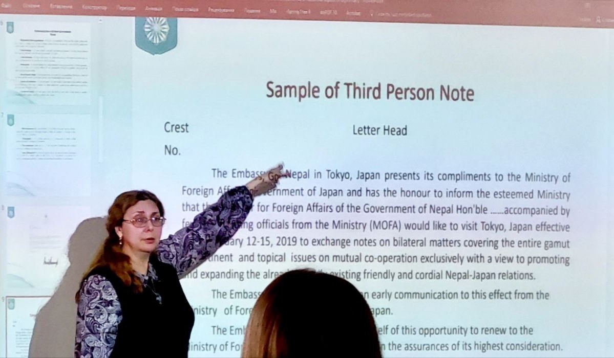 Заняття старшого викладача Книшевицької Л.В. на тему «Communication as an essential aspect of diplomacy» в модулі «Trends of the modern world» вирізнялося чіткою продуманою структурою та відповідала сучасним освітнім вимогам: вступна частина, актуалізація знань, основна частина з теоретичним і практичним наповненням, а також підсумкове обговорення. Зміст заняття охоплював як письмові, так і усні форми дипломатичного спілкування, включаючи особливості дипломатичної кореспонденції, риторичні прийоми, а також елементи міжкультурної комунікації. Особливу увагу заслуговує добір автентичних матеріалів, що сприяли формуванню професійної компетентності студентів. Інтерактивні завдання, зокрема вправи на заповнення пропусків, обговорення ситуацій, рольові ігри та написання мотиваційних промов, забезпечили високий рівень залученості студентів і практичне спрямування заняття. Аналіз стилістичних прийомів та засобів, які використовували промовці з відео, дозволили Книшевицькій Л.В. доступно пояснювати студентам на реальних прикладах правила грамотної і ефективної дипломатичної комунікації, для цього студенти вправлялись також в аналізі вдалих та невдалих прикладів письмової дипломатичної комунікації.