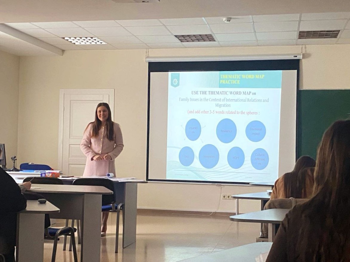 Старший викладач Гурина Н.В. під час опрацювання теми «Family issues. Migration. Shaping national identity values» показала зразок інтерактивного цікавого надзвичайно пізнавального заняття на тему, раціонально і творчо використовуючи різноманітні методи навчання та різноманітні форми навчального матеріалу (картинки, відео, картки, hand outs, mind maps). На занятті піднімались та обговорювались надскладні теми психологічних та фізичних труднощів, емоційних втрат , з якими стикаються українськи сім’ї та особливо діти під час війни. Обговорювалась тема ідентичності української сім’ї та міжнародна допомога нашім дітям-біженцям міжнародною організацією UNICEF. Прекрасне володіння предметом, методикою викладання і аудиторією, творчій підхід до поступового і дуже вдалого введення лексичного та граматичного матеріалу по темі дозволило викладачу створити неповторну творчу атмосферу, створення інтерактивного дискурсу заняття: наприклад, студентам було запропоновано описати фото сім’ї, дати всім ім’я, професії та ситуацію, в якій вони знаходяться в укриттях. Таким чином через емпатію, студенти самі стають частиною історії цієї сім’ї , не помічають, як вміло вводиться та закріплюється складний граматичний та лексичний матеріал Making assumptions , idioms in context, Cоnditionals та інші, а також як створюється перехід від конкретної лексики до складної і метафоричної. Студенти вправно оволоділи вивченим матеріалом, висловлювали свої думки та обговорювали проблемні питання.