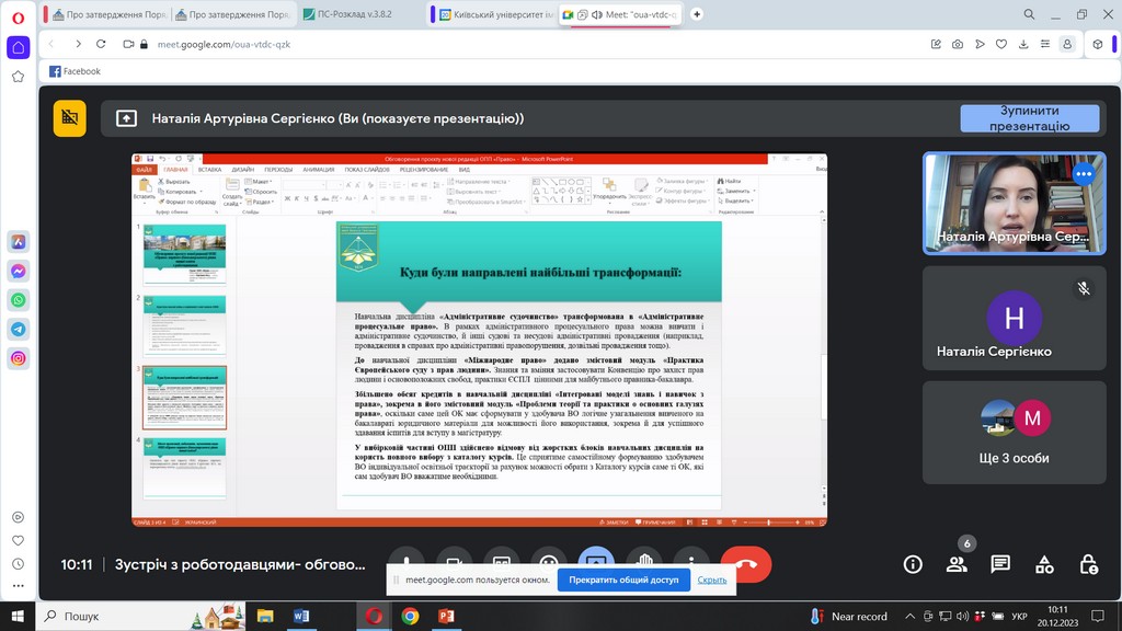 20 грудня 2023 р. відбулось обговорення проєкту нової редакції ОПП «Право» першого (бакалаврського) рівня ВО (надалі – ОП) з роботодавцями. Гарант ОП – доктор юридичних наук, професор кафедри публічного права Наталія Артурівна Сергієнко провела презентацію проєкту нової редакції ОП.