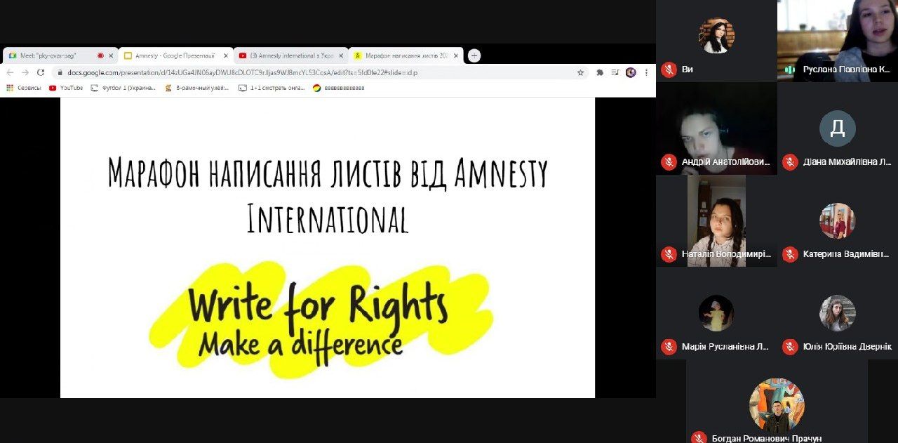 Вже за традицією студенти Факультету права та міжнародних відносин за ініціативи нашого давнього друга та партнера Міжнародної правозахисної організації Amnesty International Ukraine долучилися до 14 «Марафону написання листів» – глобальної події, яка об'єднує мільйони небайдужих в усьому світі.У рамках марафону всі охочі виступають на захист прав людей із різних країн, підписуючи онлайн петиції до урядів, а також надсилають листи солідарності героям та героїням кампанії.