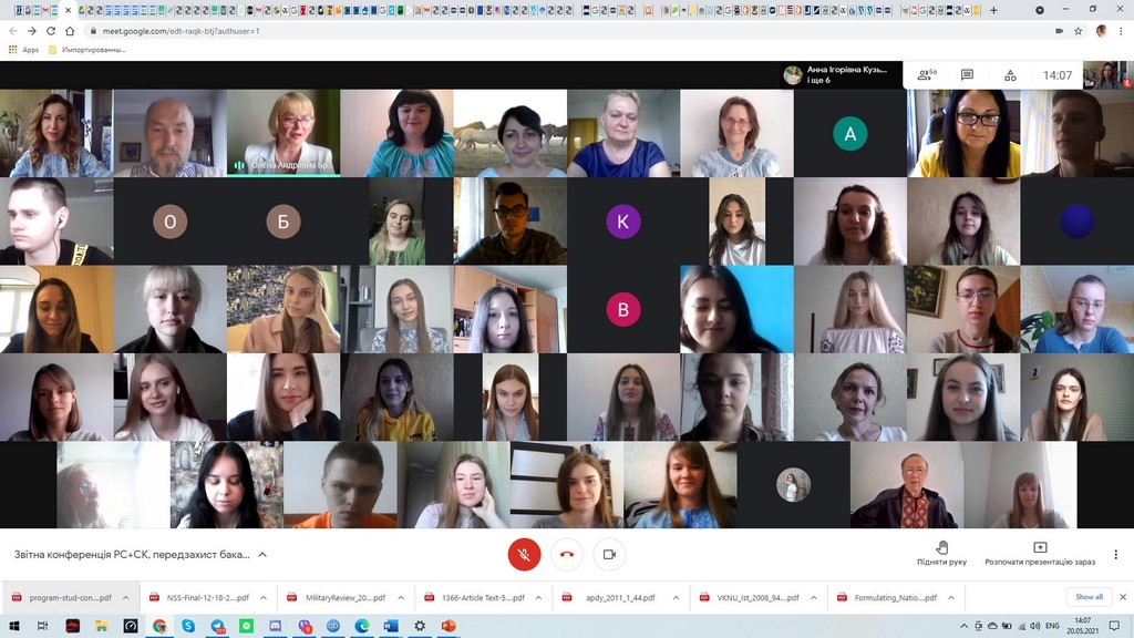 20 травня 2021 р. на кафедрі міжнародних відносин та міжнародного права Київського університету імені Бориса Грінченка відбулася остання звітна конференція, присвячена виробничим практикам. Завершилася переддипломна практика, яка у мовах локдауну відбувалася дистанційно на базі наукової бібліотеки Університету. Метою цієї практики було удосконалення здобутих знань, практичних умінь і навичок у роботі з інформаційними та бібліотечними ресурсами, оволодіння професійним досвідом, збір матеріалів, необхідних для завершення самостійного написання кваліфікаційної бакалаврської роботи.