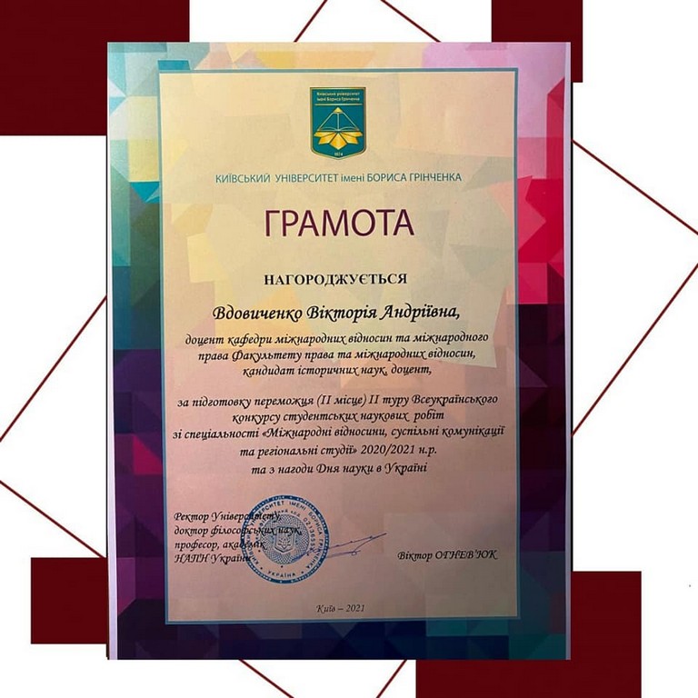 Щиро вітаємо наших колег та студентів: кандидатку історичних наук, доцентку кафедри міжнародних відносин та міжнародного права Вдовиченко Вікторію Андріївну; магістранток спеціальності «Міжнародні відносини, суспільні комунікації та регіональні студії» Шахову Оксану та Чабанюк Тетяну; студентку ІІІ курсу спеціальності «Регіональні студії» Корженівську Вікторію, студентку ІІІ курсу спеціальності «Право» Пентіло Дарю, студентку І курсу спеціальності «Міжнародне право» Купецьку Вероніку з нагородженням грамотами та подяками Університету за наукові досягнення та з нагоди Дня науки в Україні.🇺🇦