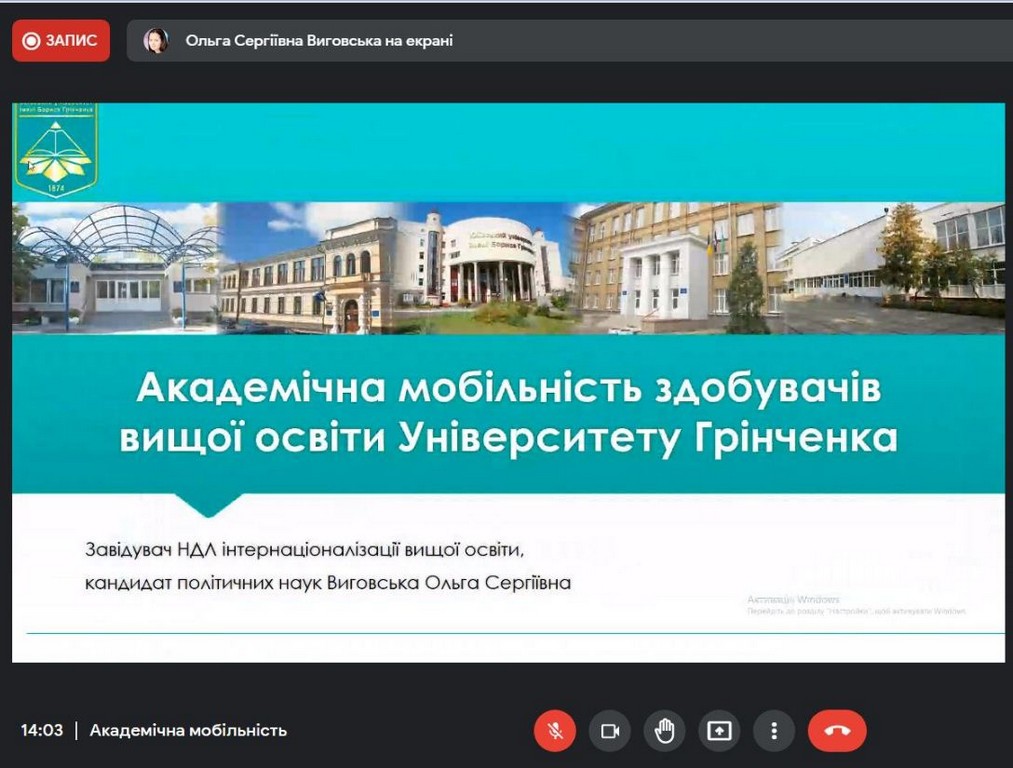 В рамках інтернаціоналізації вищої освіти у Київському університеті імені Бориса Грінченка відбулася інформаційна он-лайн зустріч для кураторів та зацікавлених викладачів щодо можливостей міжнародної академічної мобільності. Зустріч була ініційована Ольгою Сергіївною Виговською, завідувачкою Науково-дослідної лабораторії інтернаціоналізації вищої освіти, кандидатом політичних наук, доцентом кафедри міжнародних відносин та міжнародного права.