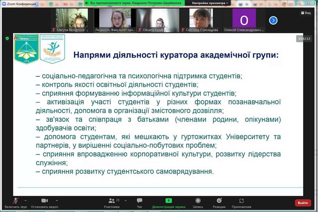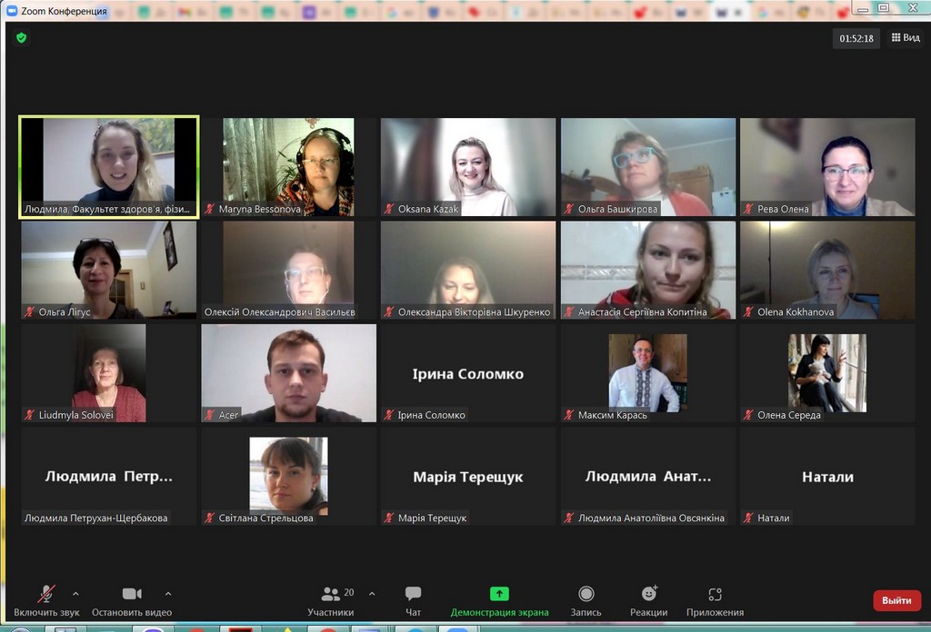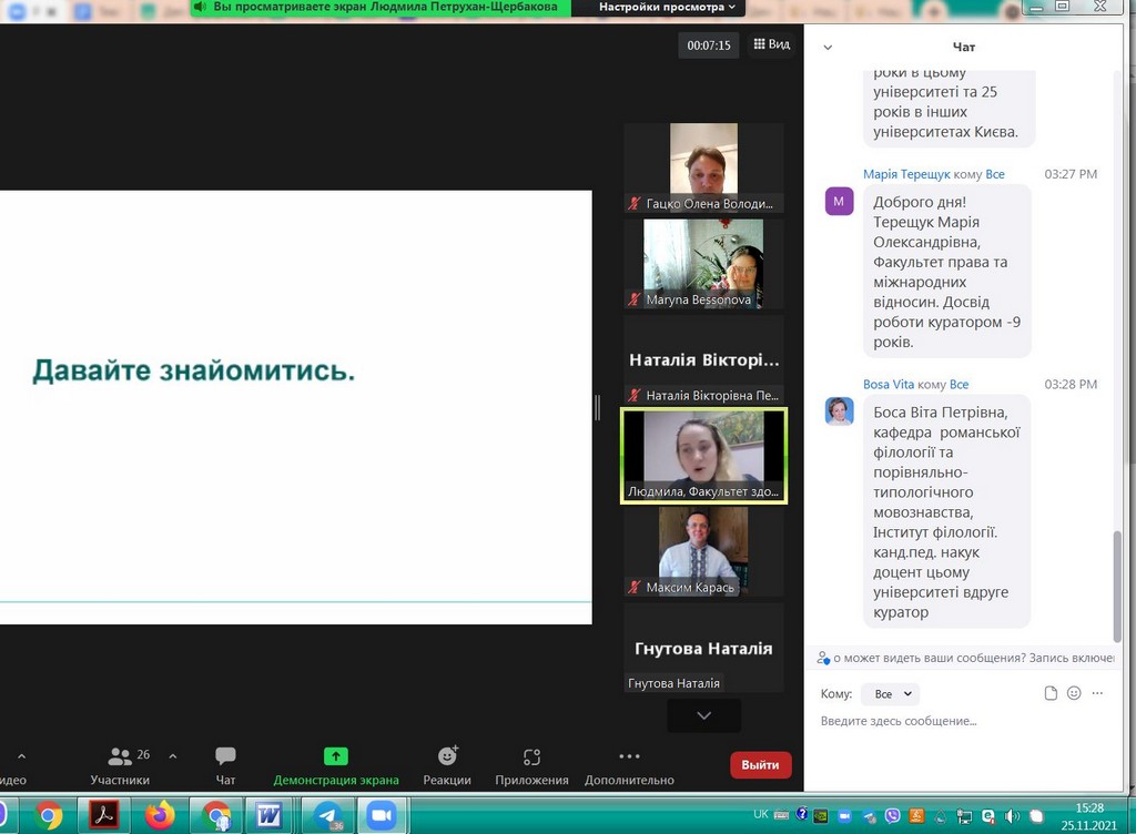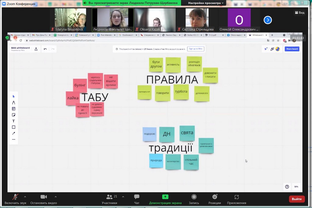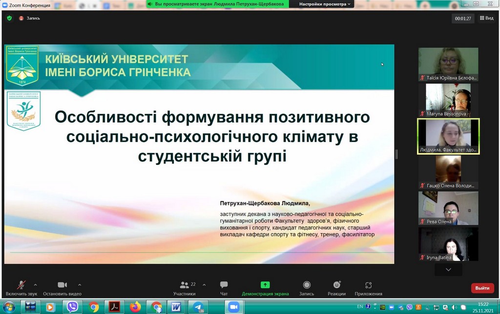 Студентоцентроване освітнє середовище Київського університету імені Бориса Грінченка передбачає допомогу та консультування кураторів академічних груп для ефективної та успішної роботи зі здобувачами вищої освіти. В рамках такої допомоги 25 листопада 2021 р. для кураторів була проведена лекція-тренінг «Особливості формування позитивного соціально-психологічного клімату в студентській групі». Заступник декана з науково-педагогічної та соціально-гуманітарної роботи Факультету здоров’я, фізичного виховання і спорту, кандидат педагогічних наук, старший викладач кафедри спорту та фітнесу, тренер, фасилітатор Людмила Юріївна Петрухан-Щербакова. Під час зустрічі куратори обговорили особливості формування, складові, показники соціально-психологічного клімату в академічних групах, поділилися своїм досвідом щодо «правил» та «табу», «традицій», які формуються у групах. Під час тренінгу були рекомендовані інструменти роботи зі здобувачами академічних груп, а також обговорені проблеми та перспективи, актуальні для груп першокурсників, роль корпоративної культури Київського університету імені Бориса Грінченка, переваги університетського цифрового кампусу та інших вимірів сприятливого освітнього середовища. Під час тренінгу були застосовані інтерактивні методики і вигляді за допомогою padlet.com та webwhiteboard.com. В онлайн лекції-тренінгу брали участь куратори академічних груп Факультету права та міжнародних відносин освітніх програм «Міжнародне право», «Регіональні студії», «Суспільні комунікації» та «Право»: Братко Ірина Василівна, Бессонова Марина Миколаївна, Пістракевич Олена Володимирівна, Терещук Марія Олександрівна.
