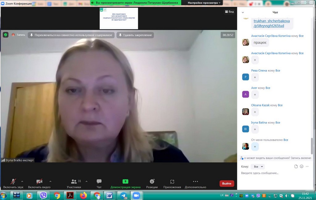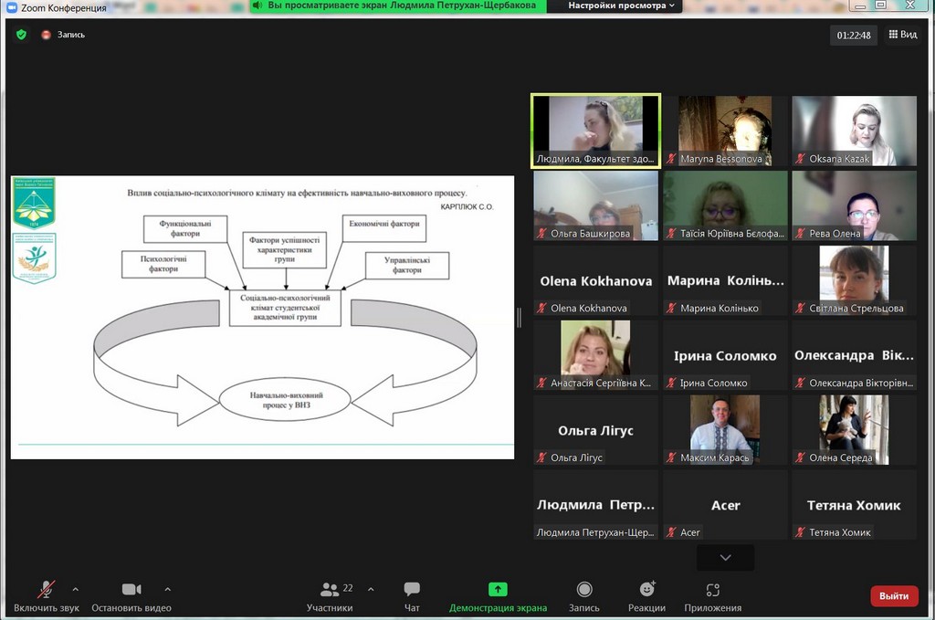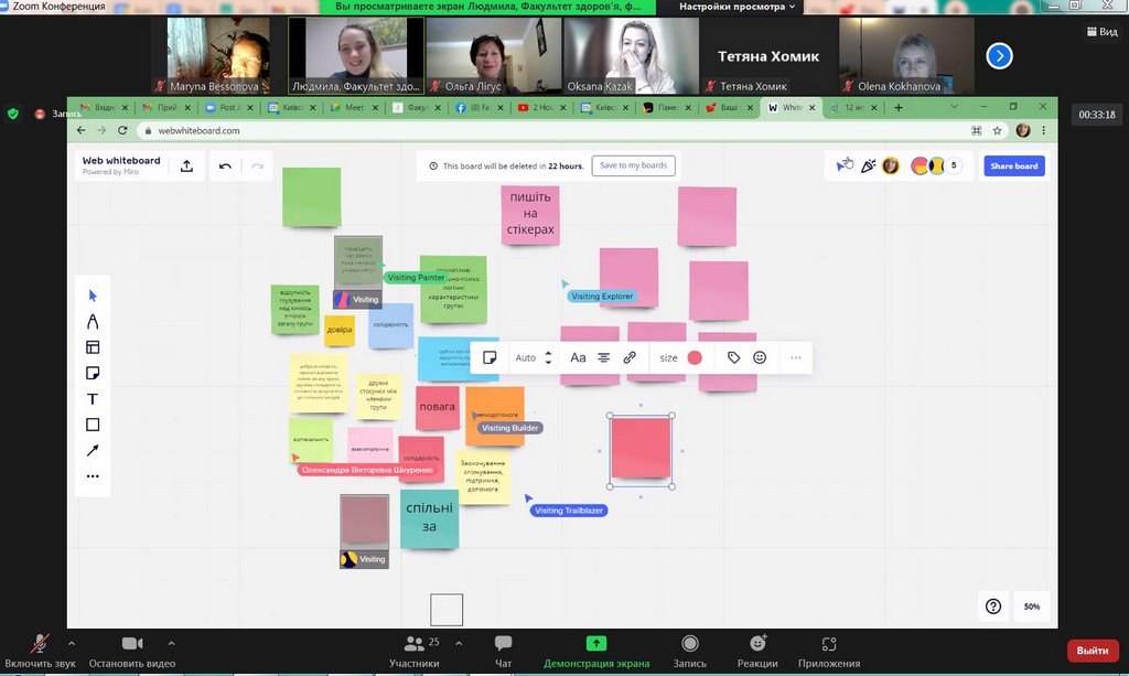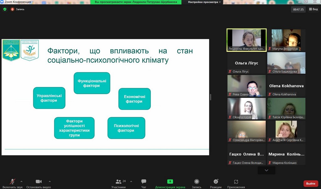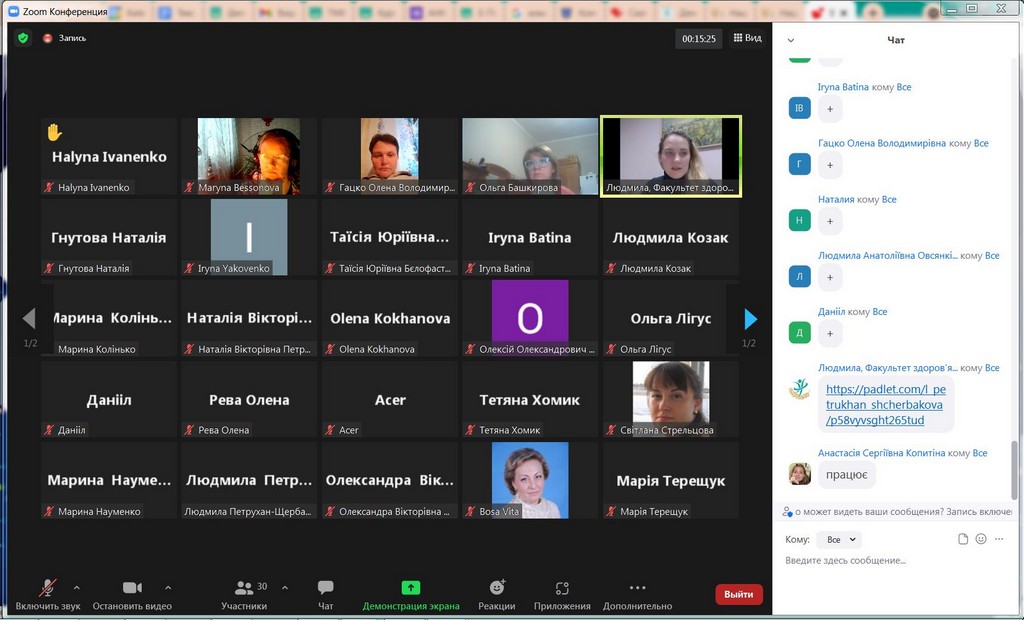 Студентоцентроване освітнє середовище Київського університету імені Бориса Грінченка передбачає допомогу та консультування кураторів академічних груп для ефективної та успішної роботи зі здобувачами вищої освіти. В рамках такої допомоги 25 листопада 2021 р. для кураторів була проведена лекція-тренінг «Особливості формування позитивного соціально-психологічного клімату в студентській групі». Заступник декана з науково-педагогічної та соціально-гуманітарної роботи Факультету здоров’я, фізичного виховання і спорту, кандидат педагогічних наук, старший викладач кафедри спорту та фітнесу, тренер, фасилітатор Людмила Юріївна Петрухан-Щербакова. Під час зустрічі куратори обговорили особливості формування, складові, показники соціально-психологічного клімату в академічних групах, поділилися своїм досвідом щодо «правил» та «табу», «традицій», які формуються у групах. Під час тренінгу були рекомендовані інструменти роботи зі здобувачами академічних груп, а також обговорені проблеми та перспективи, актуальні для груп першокурсників, роль корпоративної культури Київського університету імені Бориса Грінченка, переваги університетського цифрового кампусу та інших вимірів сприятливого освітнього середовища. Під час тренінгу були застосовані інтерактивні методики і вигляді за допомогою padlet.com та webwhiteboard.com. В онлайн лекції-тренінгу брали участь куратори академічних груп Факультету права та міжнародних відносин освітніх програм «Міжнародне право», «Регіональні студії», «Суспільні комунікації» та «Право»: Братко Ірина Василівна, Бессонова Марина Миколаївна, Пістракевич Олена Володимирівна, Терещук Марія Олександрівна.