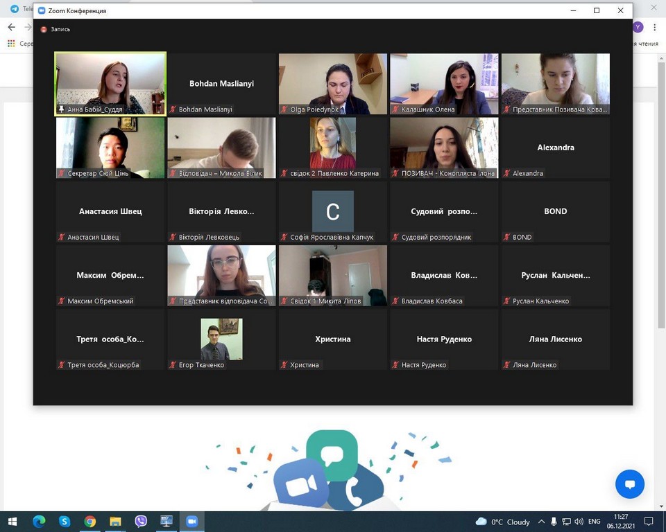 Студенти 3 курсу Факультету права та міжнародних відносин 06.12.2021 року, за ініціативи к.ю.н., доцента кафедри публічного та приватного права, адвоката БФ «Право на захист» Калашник Олени Миколаївни, долучились до moot court на тему: «Захист прав мігрантів», який проходив в Інституті міжнародних відносин КНУ імені Тараса Шевченка, організований Поєдинок Ольгою Романівною, к. ю. н., доцентом кафедри міжнародного права ІМВ. Калшник О. М., надала студентам реальний кейс у справі про скасування рішення Державної міграційної служби України про відмову у визнанні особи біженцем або таким, що потребує додаткового захисту та зобов'язання цього органу влади повторно розглянути заяву особи про визнання біженцем або таким, що потребує додаткового захисту. Студенти склали сценарій судового засідання в адміністративній справі на підставі вищенаведеного кейсу та провели імітацію відкритого судового засідання в режимі відеоконференції. Подібні заходи корисні для студентів обох ВУЗів з метою обміну досвіду, знань та налагодженню друзніх зв'язків.