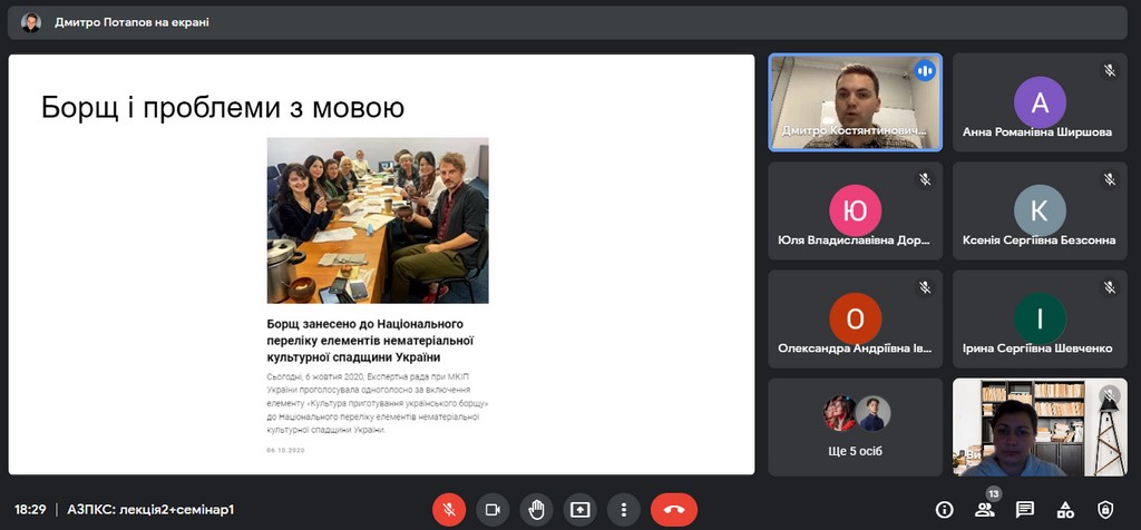 Дмитро розповів про ті проєкти, які реалізує «Інститут культури України». Але особливу увагу присвятив етапам, особливостям, специфіці реалізації такого важливого всеукраїнського проєкту, як включення елементу «культури приготування українського борщу» до Національного переліку елементів нематеріальної спадщини, що й відбулося 6 жовтня 2020 року. Цій події передувала експедиція, під час якої було відзнято 24 відео-рецепти приготування борщу в різних регіонах нашої країни. Рецепти приготування борщу, можна побачити на сайті ГО «Інститут культури України» (http://uacult.com/recipes). Паралельно відбувалася промоція проєкту в провідних українських та світових ЗМІ, посольствах іноземних держав в Україні.