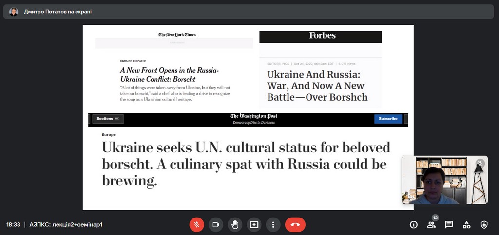 15 лютого 2022 року відбулася онлайн-лекція для здобувачів другого (магістерського) рівня освітньої програми «Регіональні студії» Дмитра Потапова, випускника кафедри міжнародних відносин та міжнародного права, спеціальності 291 «Міжнародні відносини, суспільні комунікації та регіональні студії», менеджера з міжнародних комунікацій Громадської організації «Інститут культури України». Головна мета даної організації – забезпечення охорони культурної спадщини, зокрема, збереження ідентичної уніфікованої української кухні та популяризації України в світі, становлення у громадах українських культурних цінностей.