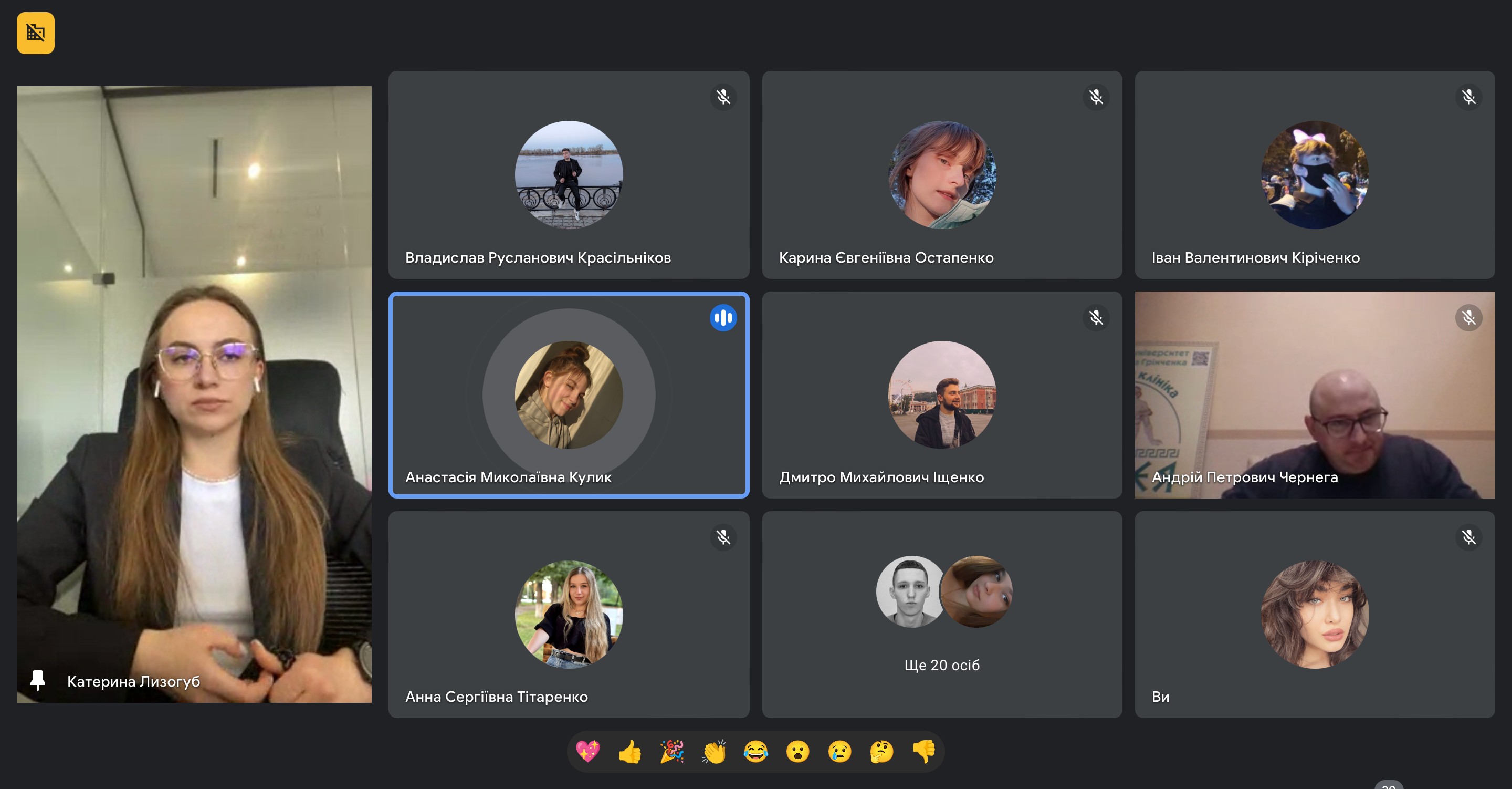 Катерина Лизогуб презентувала майстер-клас на тему: «Особливості здійснення місцевого самоврядування в місті Києві в умовах воєнного стану: Київська міська рада». Студенти мали чудову можливість побачити і послухати відмінницю навчання, екс-юркліністку (2014-2018 рр.) безпосередньо прийняти участь у дискусії. Звертаючись до учасників заходу, Катерина розповіла, що відповідно до Конституції України і Законів України «Про місцеве самоврядування» та «Про місцеві вибори» ( в частині положень які не втратили чинність після прийняття Виборчого кодексу щодо організації та проведення повторних, проміжних, додаткових виборів і заміщення депутатів, обраних у багатомандатному виборчому окрузі, повноваження яких достроково припинені, що діють до наступних чергових або позачергових виборів депутатів місцевих рад) та Виборчого кодексу України – депутатом місцевої ради може стати громадянин України, що досяг повноліття (18 років), якого було обрано на основі загального, рівного, прямого виборчого права шляхом таємного голосування строком на 5 років. Наразі в Київраді працює 120 депутатів, з яких 70 – це коаліція представлена політичними силами від партій ЄС, Удар та Голос. Депутати на місцях представляють інтереси своїх виборців, причому їх кількість коливається від 11 тис. (Голосіївський район) до 29,6 тис. (Соломʼянський район) міста Києва. В середньому навантаження виборців на одного депутата в місті Києві складає 17,6 %.