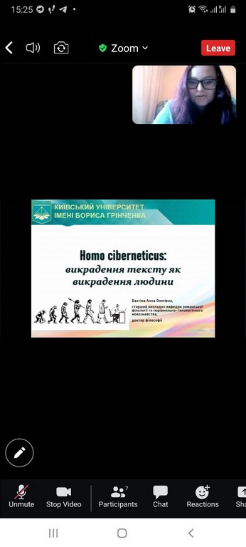 5 жовтня 2023 р. кандидат історичних наук, доцент, куратор групи СКб-1-22-4.0д Ганна Мельник разом зі студентами 2 курсу, які навчаються на освітній програмі “Суспільні комунікації” взяли участь у онлайн-дискусії "Homo ciberneticus: викрадення ідеї як викрадення людини?". Під час заходу обговорили питання дотримання академічної доброчесності як здобувачами вищої освіти, так і науково-педагогічними працівниками Університету Грінченка.
