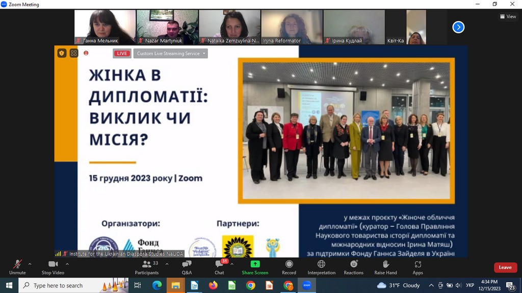15 грудня 2023 року кандидат історичних наук, доцент, доцент кафедри міжнародних відносин Ганна Мельник взяла участь в онлайн-заході "Жінка в дипломатії: виклик чи місія?", який проходив у межах реалізації проєкту Наукового товариства історії дипломатії та міжнародних відносин "Жіноче обличчя дипломатії" (куратор - професор Ірина Матяш). Організаторами події стали Наукове товариство історії дипломатії та міжнародних відносин, Фонд ГаннсаЗайделя в Україні в партнерстві з Національним університетом "Острозька академія", Платформою "Подружжя українських дипломатів", Всеукраїнською громадською організацією "Територія Жінок".