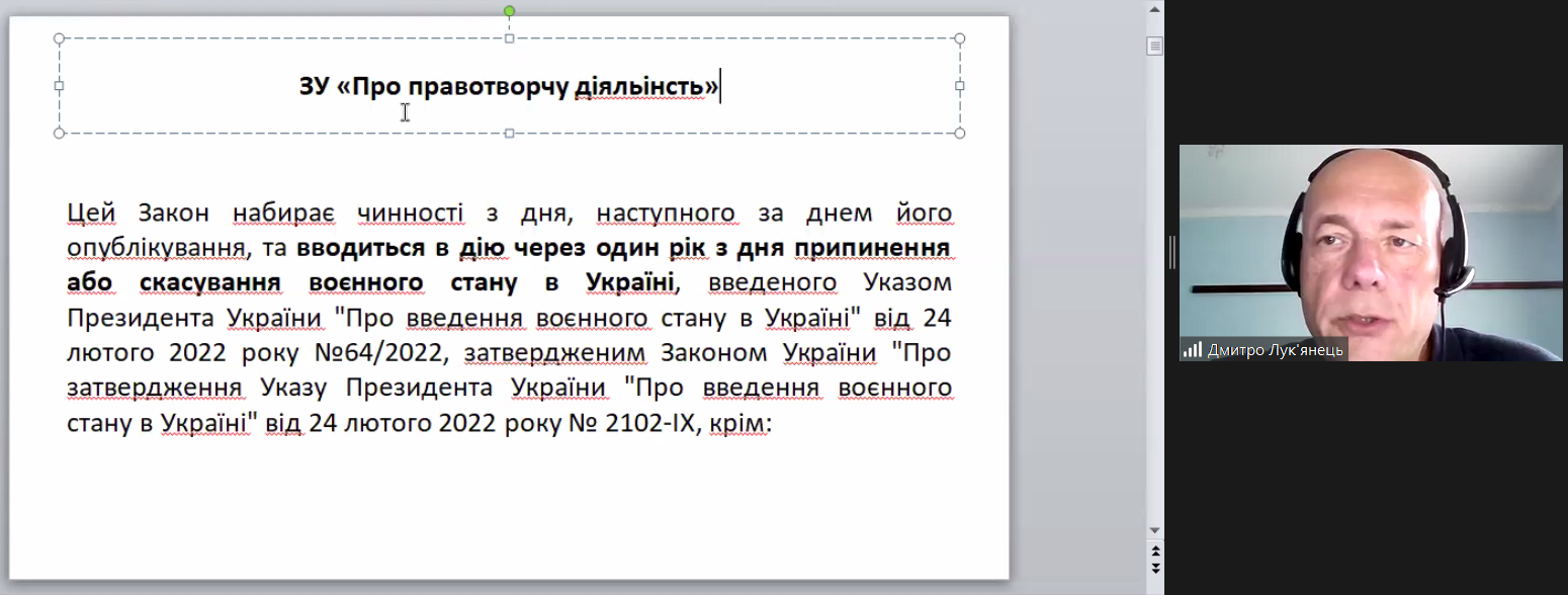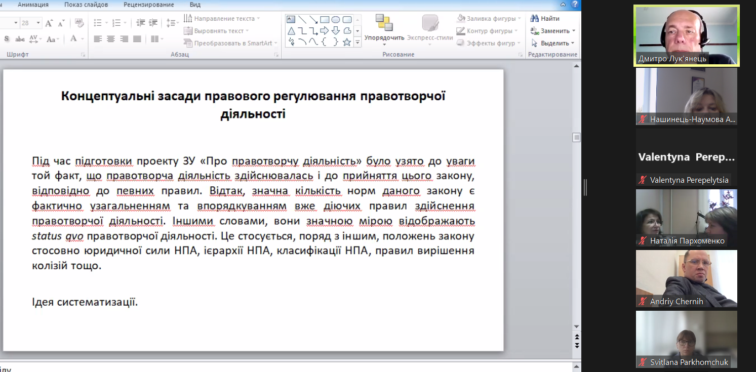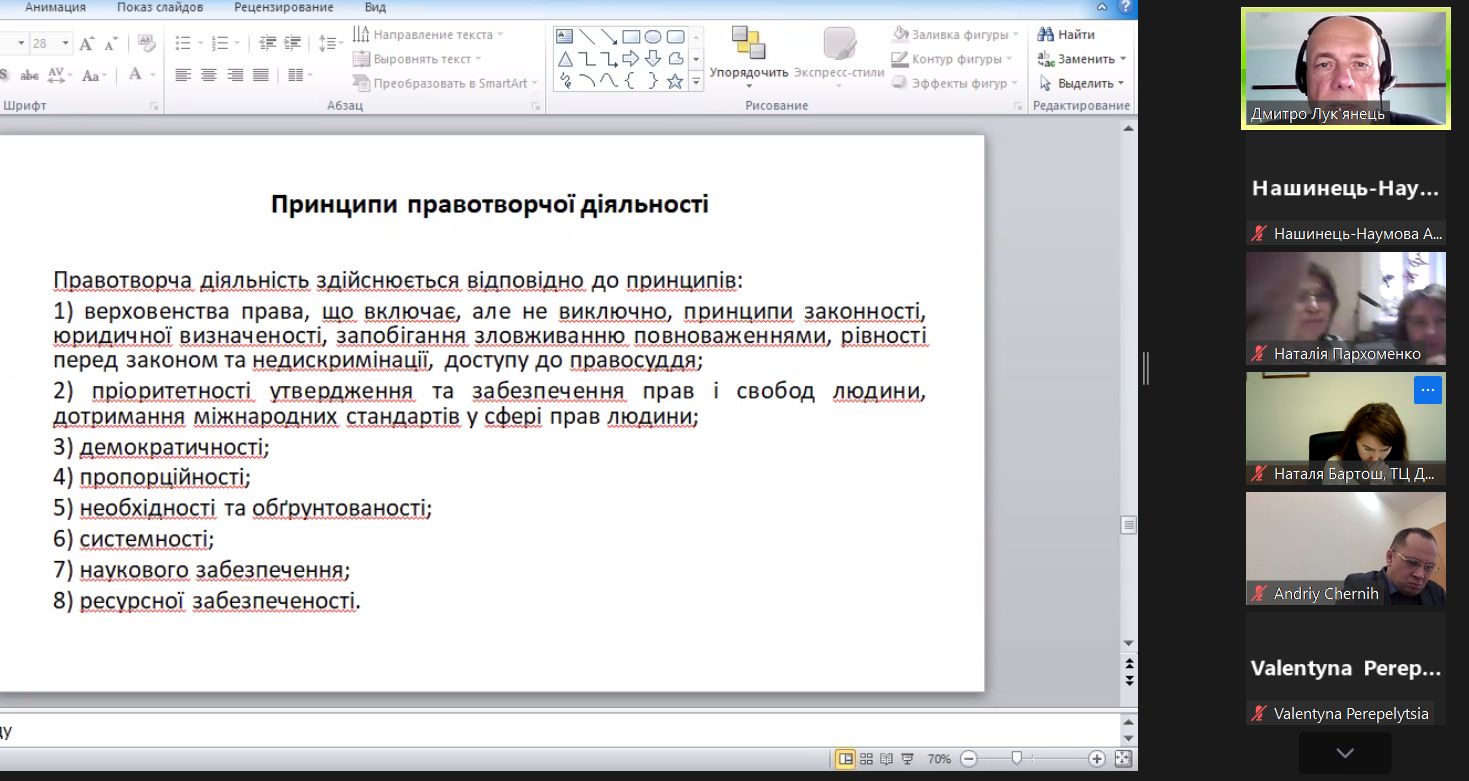 Під час навчання були розглянуті актуальні теми правотворчої діяльності, зокрема: теоретично-прикладні аспекти правотворчої діяльності; підготовка проєкту нормативно-правового акту; особливості дії нормативно-правого акту; проблеми правового моніторингу тощо.