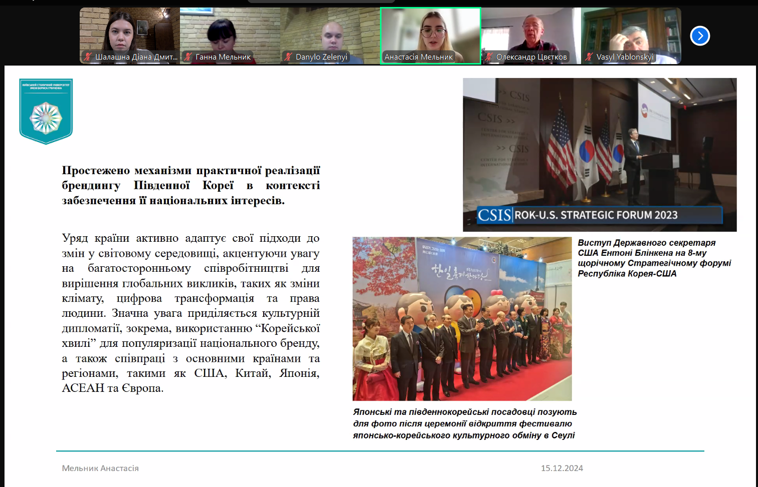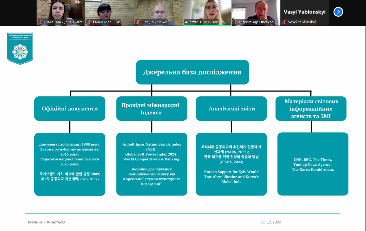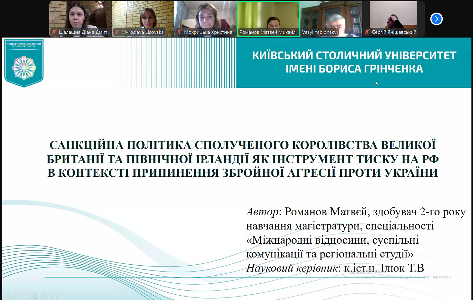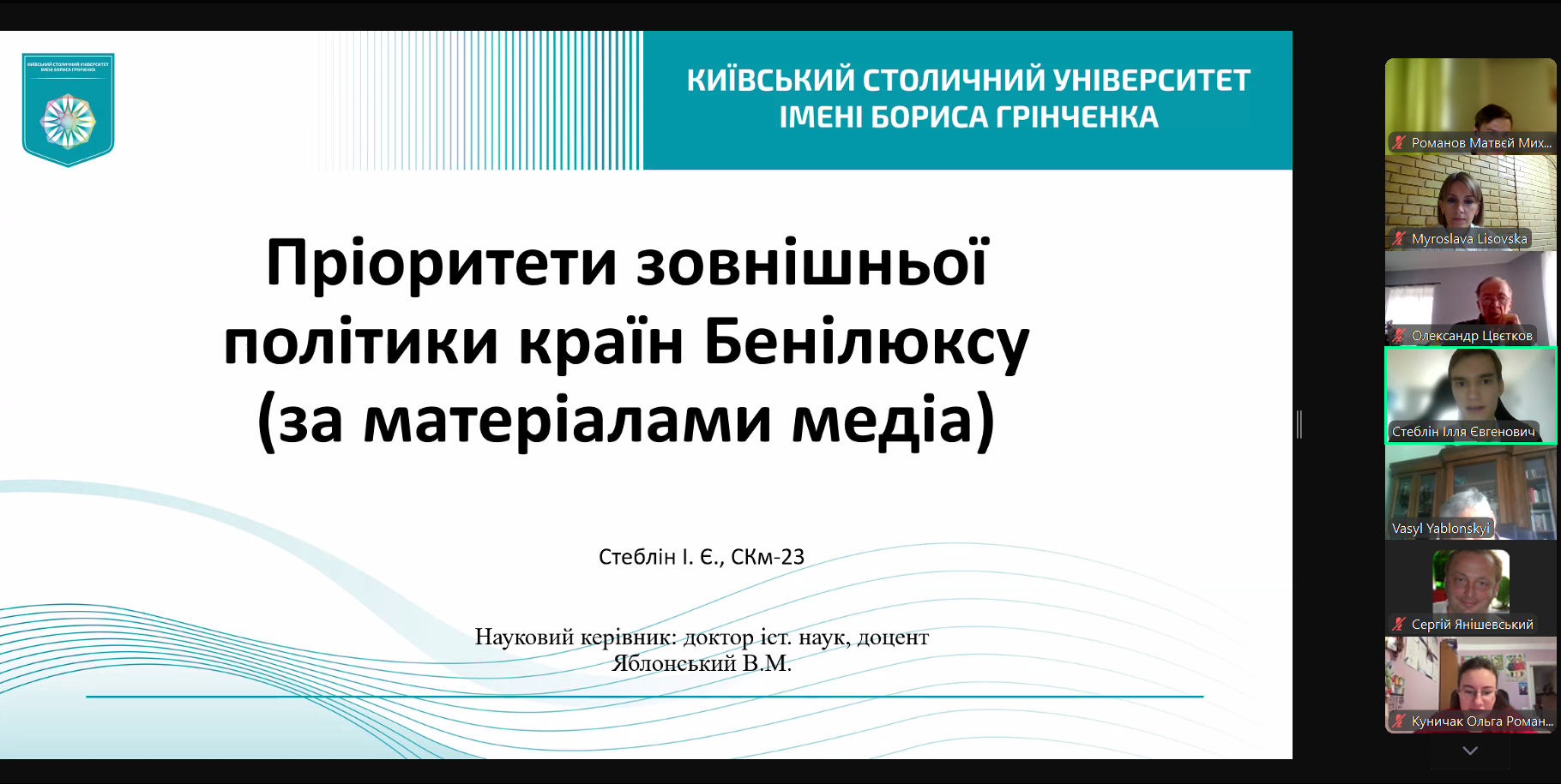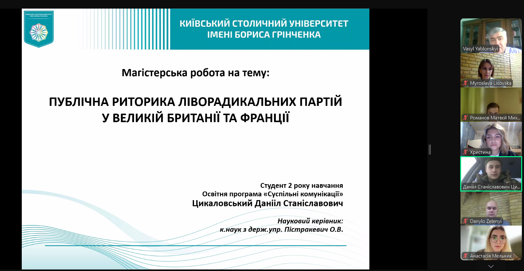 16 грудня 2024 р. відбувся захист кваліфікаційних магістерських робіт здобувачів освітньо-професійної програми «Суспільні комунікації» другого (магістерського) рівня вищої освіти. Здобувачами були представлені дослідження на актуальні теми, присвячені пріоритетам зовнішньої політики країн Бенілюксу, формуванню іміджу Великої Британії, публічній риториці ліворадикальних партій у Великій Британії та Франції, ролі медіа в російсько-українській війні, проблемам санкційної політики Великої Британії, брендингу як інструменту реалізації зовнішньої політики Південної Кореї.