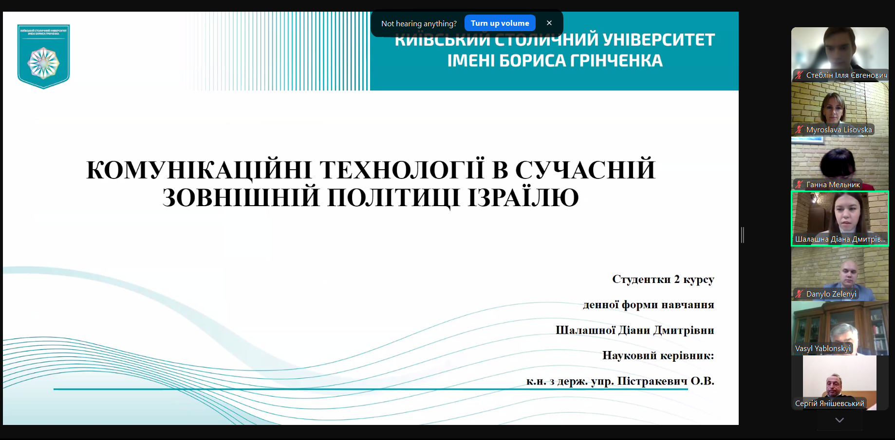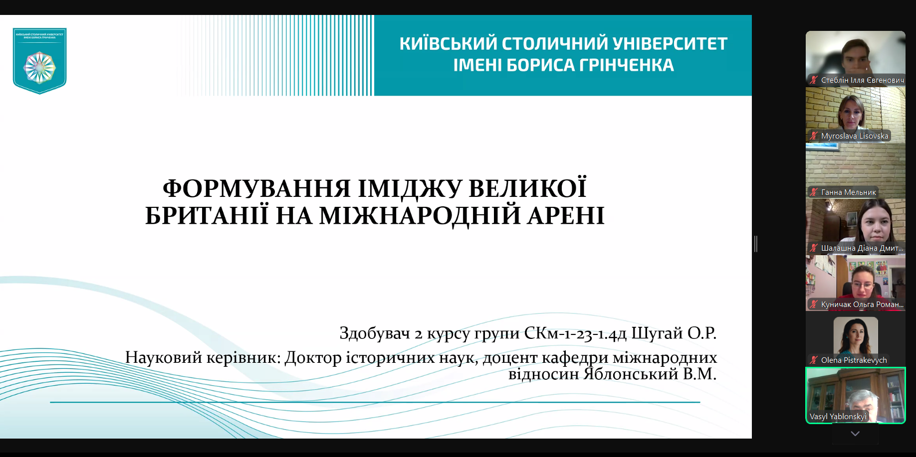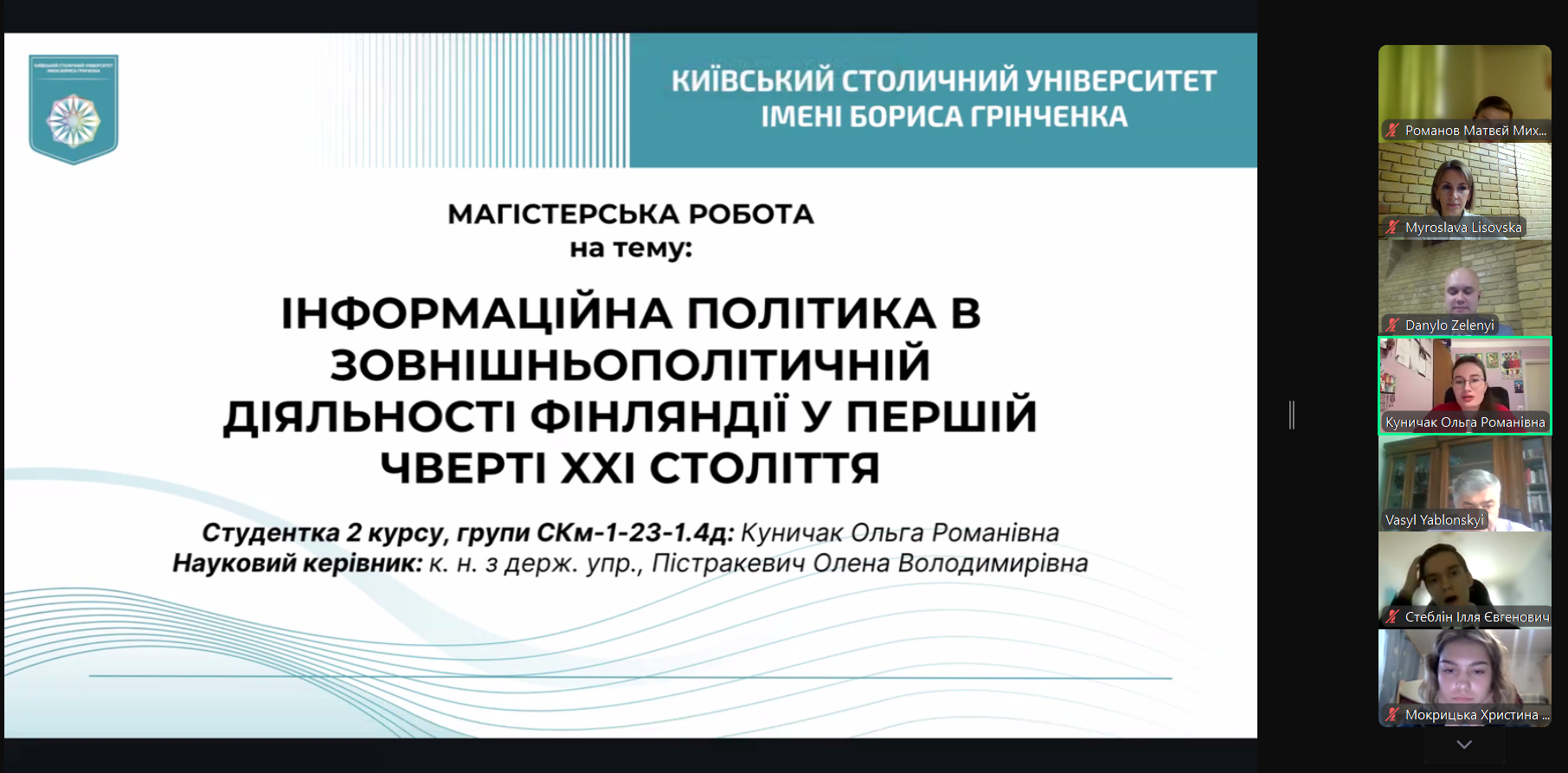 Екзаменаційна комісія відзначила роботи Данила Зеленого на тему «Трансформація публічної риторики лідерів Великої Британії щодо повномасштабної російсько-української війни» (науковий керівник – доцент кафедри міжнародних відносин, к.і.н. Тетяна Ілюк), Ольги Куничак на тему «Інформаційна політика в зовнішньополітичній діяльності Фінляндії у першій чверті XXІ століття» (науковий керівник – доцент кафедри міжнародних відносин, к.н. з держ.упр. Олена Пістракевич), Діани Шалашної на тему Комунікаційні технології в сучасній зовнішній політиці Ізраїлю (науковий керівник – доцент кафедри міжнародних відносин, к.н. з держ.упр. Олена Пістракевич).