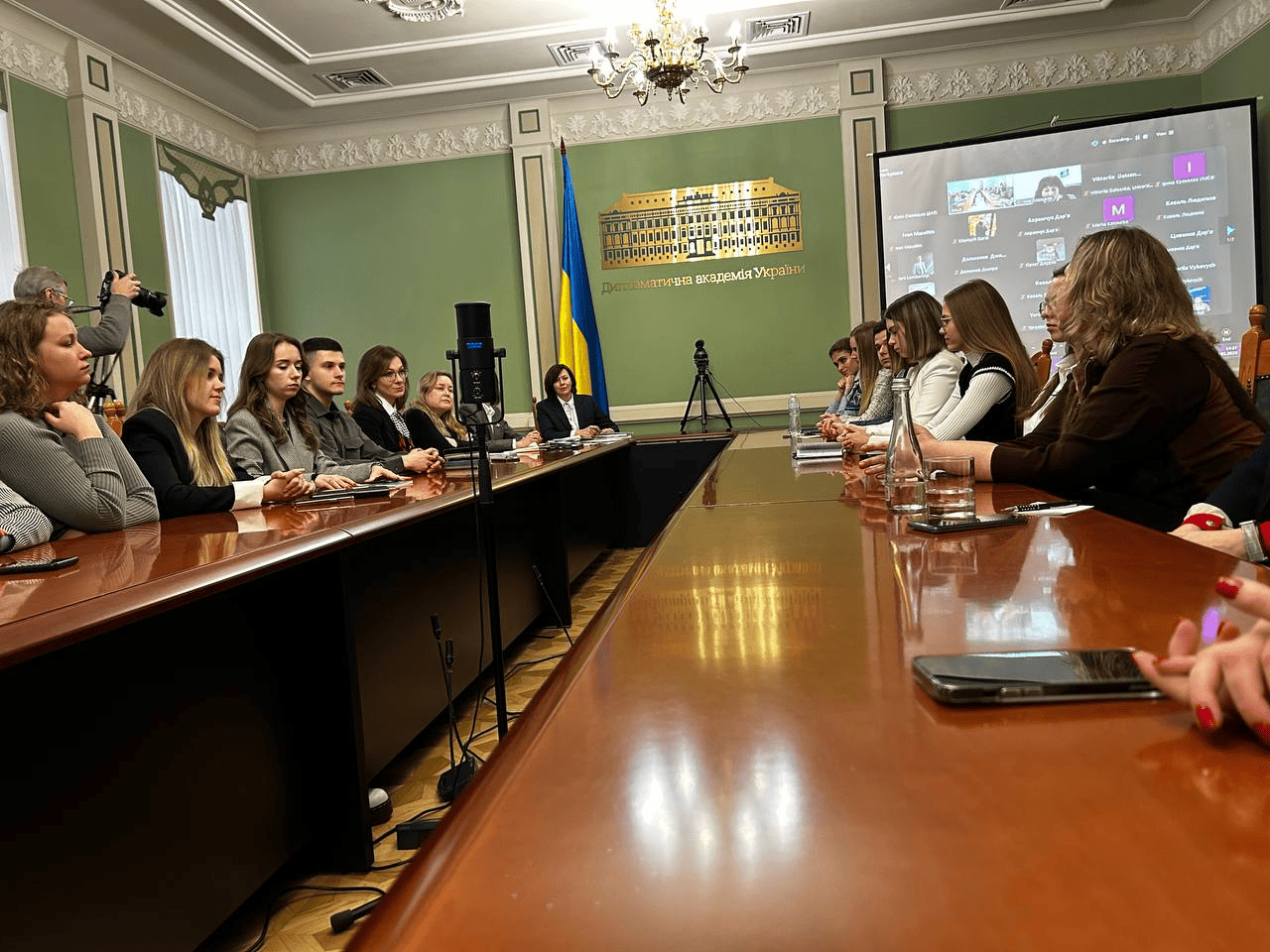 До зустрічі, що проходила у Дипломатичній академії України, долучилися і студентки 2-го курсу Факультету права та міжнародних відносин Київського столичного університету імені Бориса Грінченка Софія Дмитренко, Юлія Демська та Анастасія Зімбіцька під керівництвом доцентки кафедри міжнародних відносин, очільниці Інформаційно-аналітичного центру ФПМВ Тетяни Ілюк. Представниці Університету Грінченка поділилися з присутніми власними напрацюваннями в царині публічної дипломатії, розповіли про роботу щодо формування практичних навиків реалізації проєктів публічної дипломатії на Факультеті права та міжнародних відносин, про наявні проєкти промоції України в студентському середовищі зарубіжних країн та дослідження з публічної дипломатії, які проводяться при Інформаційно-аналітичному центрі ФПМВ.