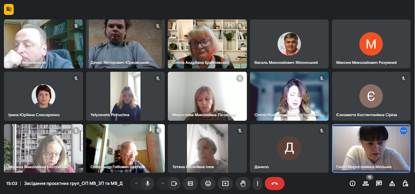 Керівники проєктних груп канд. іст. наук, доцент Ганна Мельник та докт. політ. наук, проф. Максим Розумний, доповіли про результати  роботи. Зокрема,   проєктними групами розроблено та  представлено проєкти описів освітньо-професійних програм та навчальних планів.