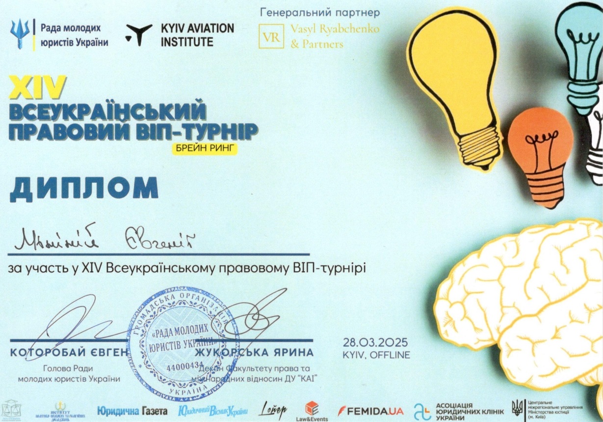 28 березня 2025 року команда «ЮК АСТРЕЯ» Факультету права та міжнародних відносин Університету Грінченка (Максим БАБЯК, Аліна ДЗЯМКО, Євгенія МІНІНА, Нараз ДОРОШ, Іван МІКУЛЕНКО – студенти ІІ, ІІІ та V курсів) взяла участь у щорічному Всеукраїнському правовому ВІП-турнірі, де мала можливість продемонструвати свої теоретичні та практичні уміння, знання та навички.