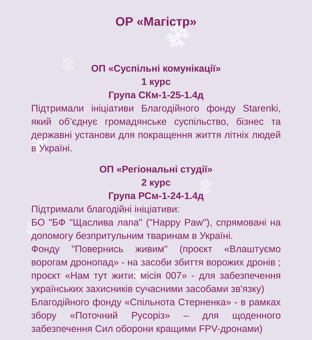 Отже, в межах «Благодійного різдвяного Марафону добрих справ - 2025» кожна академічна група Факультету взяла участь в окремій благодійній ініціативі. Детальніше можете ознйомитись на фото.