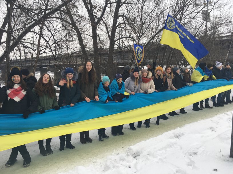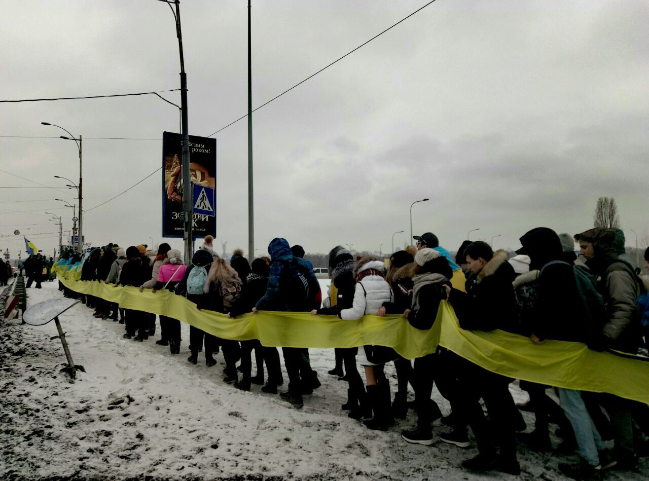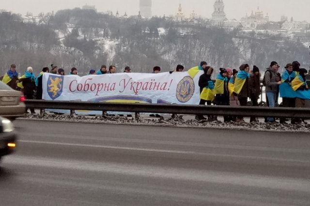 Спершу учасники акції на правому та лівому берегах Дніпра сформували дві колони, одна з яких тримала полотнище блакитного кольору, інша - жовтого. Колони несли частини українського стягу довжиною 30 метрів і, таким чином, після возз'єднання утворили не лише живий ланцюг, а і 30-метровий прапор України на мосту Патона.