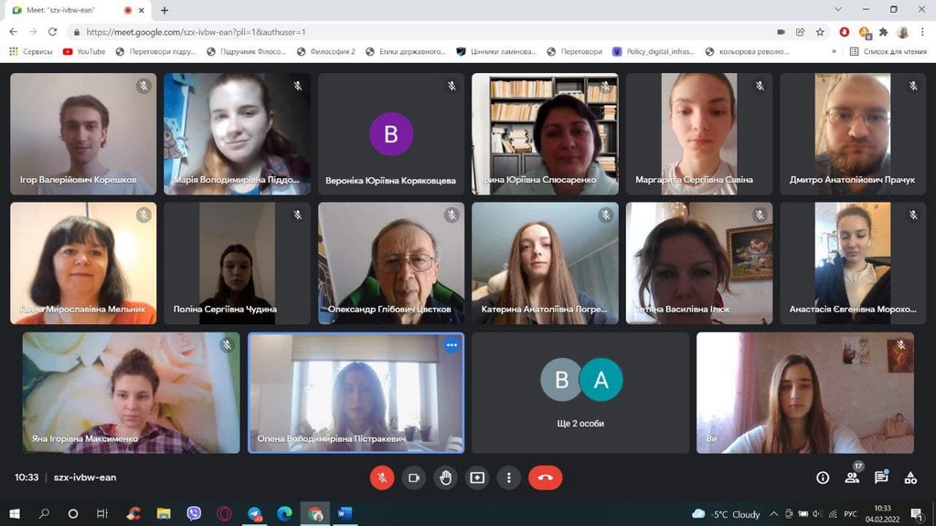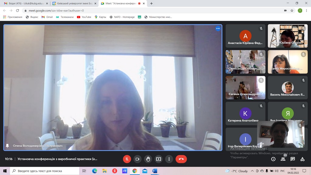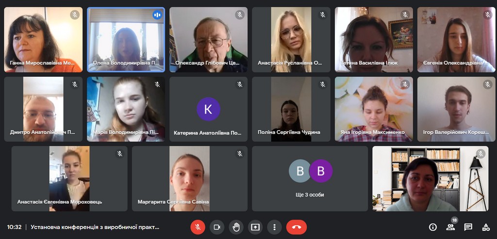 04 лютого 2022 р. на платформі Google Meet відбулася установча конференція напередодні виробничої практики (консульська робота) студентів 4 курсу першого (бакалаврського) рівня вищої освіти спеціальності «Міжнародні відносини, суспільні комунікації та регіональні студії» освітньої програми «Суспільні комунікації». Практика проводиться відповідно до Положення про проведення практики студентів Київського університету імені Бориса Грінченка. Виробнича практика, присвячена консульській роботі, спрямована на оволодіння сучасними методами, формами організації та навичками праці в галузі міжнародних відносин; формування професійних умінь для прийняття самостійних рішень під час вирішення практичних завдань у консульській роботі; формування навичок виконавчої діяльності працівника консульської служби, професійних вмінь використання технічних і програмних засобів в їх майбутній професії. На установчій конференції були присутні студенти та керівники практики від кафедри міжнародних відносин та міжнародного права. Організувала та провела установчу конференцію доцент кафедри, кандидат наук з державного управління Пістракевич Олена.