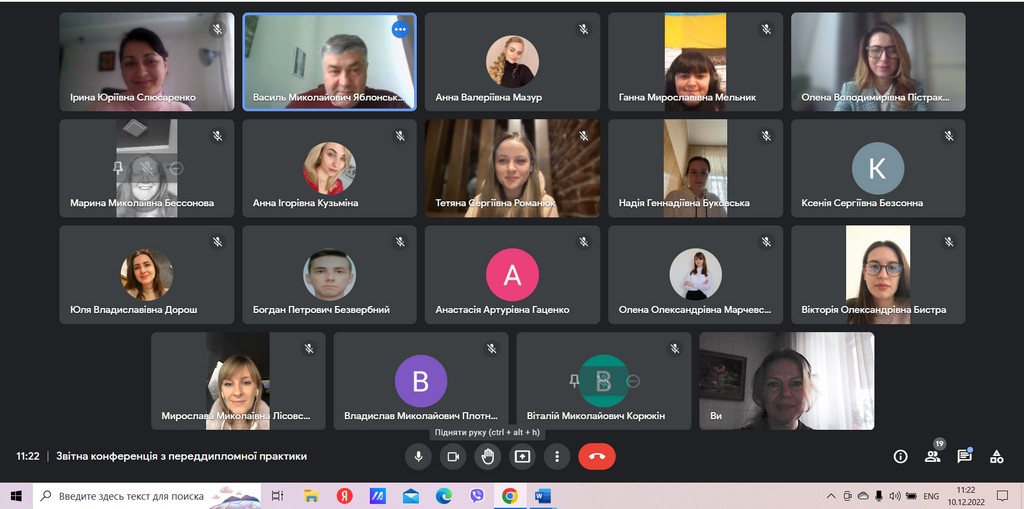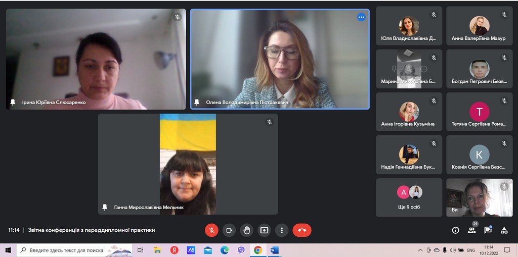 10 грудня 2022 р. на платформі Google Meet відбулася звітна конференція з переддипломної практики студентів другого (магістерського) рівня вищої освіти денної форми навчання спеціальності 291 «Міжнародні відносини, суспільні комунікації та регіональні студії».