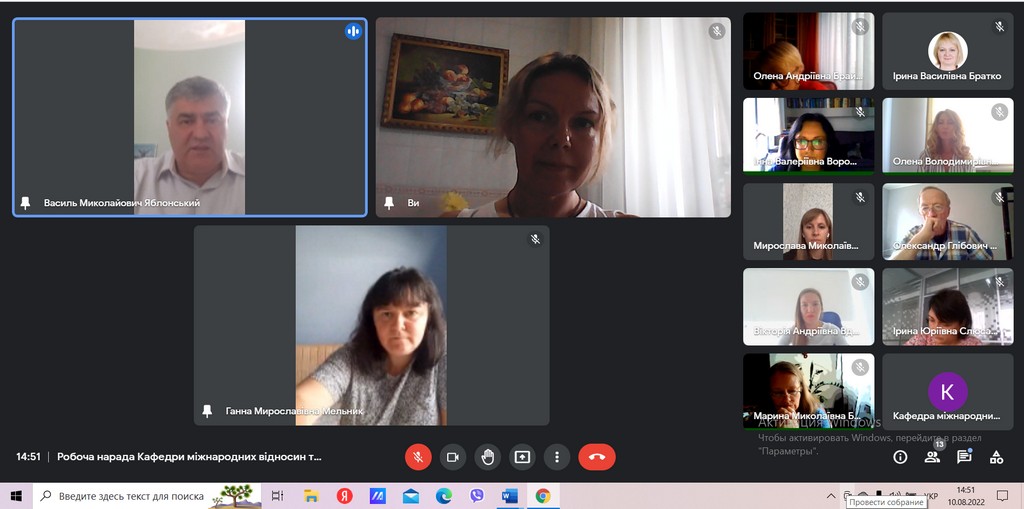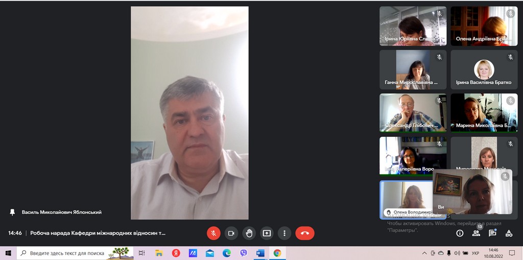 10 серпня 2022 року відбулося засідання кафедри міжнародних відносин та міжнародного права. Під час засідання було обговорено робочі питання діяльності кафедри, проблеми проведення вступної кампанії та окремі аспекти удосконалення освітніх програм “Суспільні комунікації” і “Регіональні студії”. Приємно констатувати, що попри усі труднощі воєнного часу, склад кафедри активно працює та демонструє чудові результати.