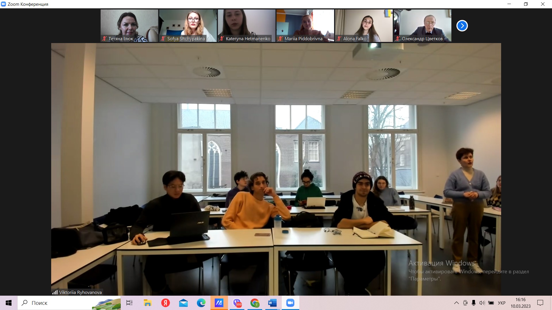 Під час англомовної онлайн-зустрічі студенти обговорили питання самоідентифікації українців, значення рідної мови у її формуванні, цивілізаційного вибору українців, місця нашої держави у світовому співтоваристві. Студенти нашого університету поділились особистим досвідом переживання страшних подій війни, розповіли, як українська молодь та суспільство реагують на події, що відбуваються, як вони адаптувалися до поточних умов життя. Розповіли колегам, наскільки війна змінила їхній власний світогляд і ще більше утвердила цінність власної незалежності, української мови й ідентичності для майбутніх поколінь. З величезним інтересом студенти Лейденського університету ознайомилися із фото сучасних інсталяцій PinchukArtCentre, пов‘язаних із війною, на прикладі яких було наочно продемонстровано культурні зміни, що відбуваються сьогодні в українському суспільстві.