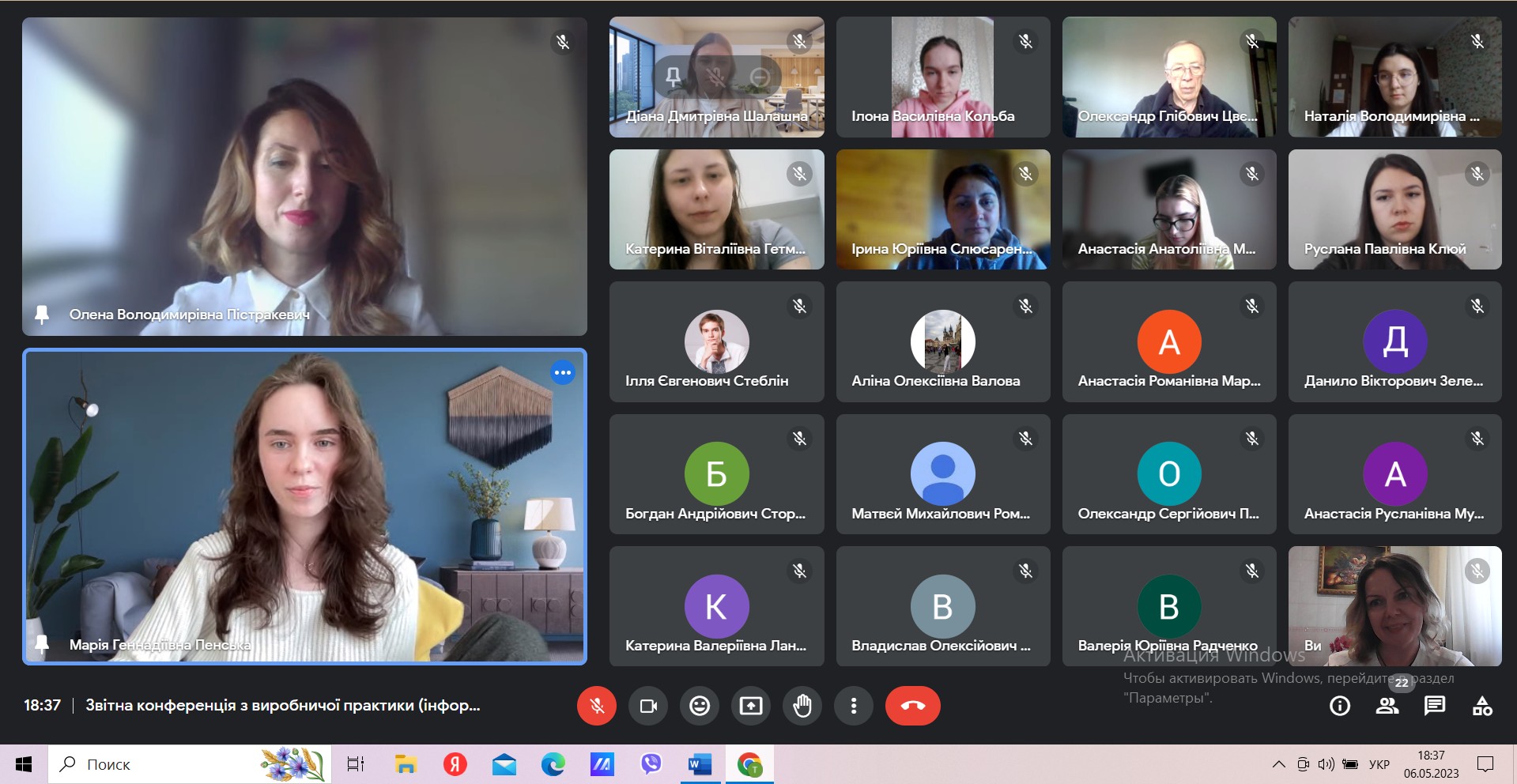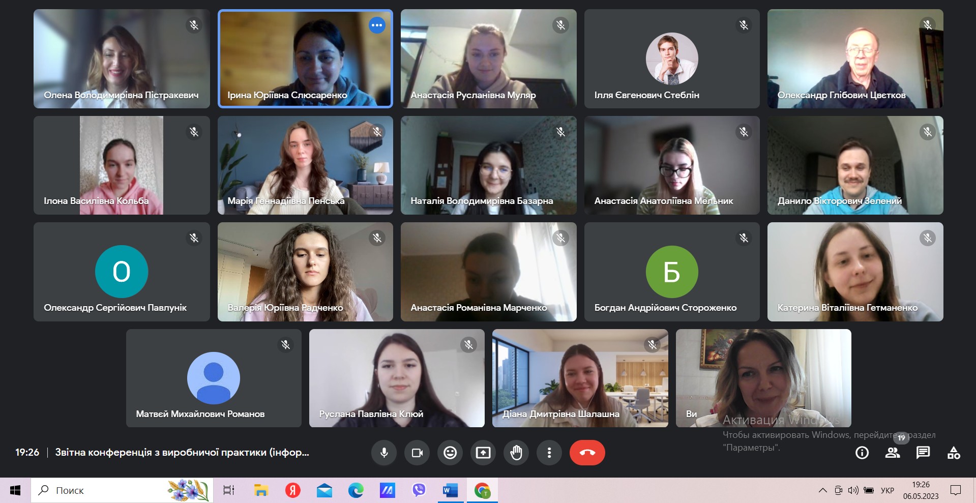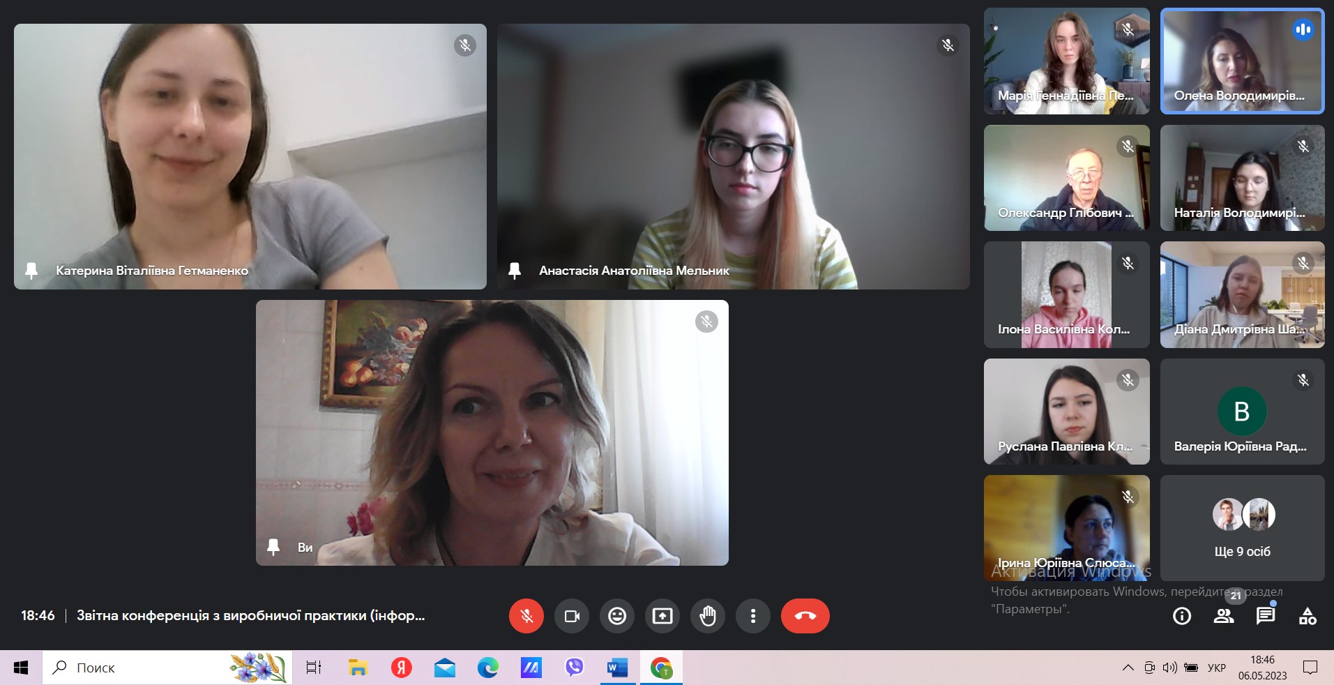 06 травня 2023 року відбулася звітна конференція проходження виробничої практики (інформаційно-аналітична робота) для студентів 4 курсу освітньої програми "Суспільні комунікації". Під час звітної конференції студенти прозвітували про форми роботи та завдання, які вони виконували під час практики, обговорили компетентності та навички, які отримали при виконанні завдань, розповіли про свої враження від проходження практики. Практика проходила з 06 квітня по 06 травня 2023 року на базі ГО «Пан’європейський союз України», ГО «Європейський інститут», ГО «Дипломатія в дії», Відділ апостилю, нотаріату та витребування Управління консульських послуг Департаменту консульської служби, Подільський районний у м. Києві відділ фізичного здоров’я населення «Спорт для всіх», Адвокатське Бюро «Сергія Ігольнікова», ТОВ «Хелзджой» та ТОВ «Джубл». Конференція відбулася на платформі Google Meet. Участь в конференції прийняли студенти 4-го року навчання першого (бакалаврського) рівня вищої освіти ОП «Суспільні комунікації» та керівники практики від університету. Організувала та провела конференцію кандидат наук з державного управління, доцент кафедри міжнародних відносин Олена Пістракевич. Підводячи підсумки проходження практики в умовах війни, варто відмітити, що студенти зуміли показати високий рівень професійної підготовки, вміння використовувати здобуті у процесі навчання навики на практиці та чудово впоралися із виконанням практично значущих завдань.