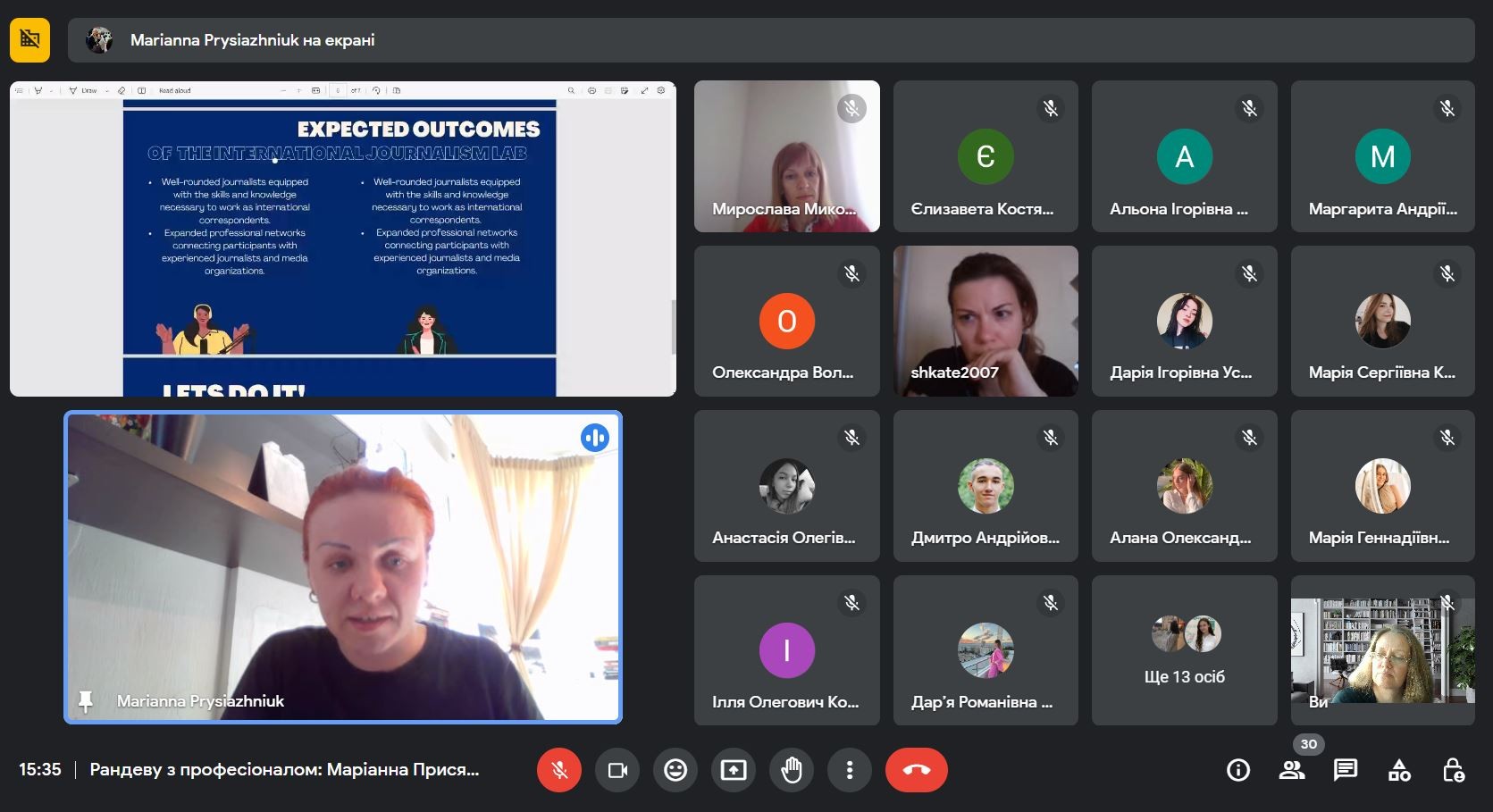 02 червня 2023 р. в рамках ініціативи кафедри міжнародних відносин «Рандеву з професіоналом» відбулася онлайн зустріч здобувачів бакалаврських ОП «Суспільні комунікації» та «Регіональні студії» з Маріанною Присяжнюк, журналісткою видання Главком та учасницею проєкту StopFake. Пані Маріанна розповіла нашим студентам про свій досвід співпраці з українськими, румунськими, німецькими, молдовськими ЗМІ, про дослідження феномену пропаганди й дезінформації, про роботу над книгою «Війна в Європі. Україна, Румунія, Республіка Молдова та агресія РФ», яку пані Маріанна написала спільно з професором Бухарестського університету Раду Карпом. Студенти дізналися про особливості комунікації, які супроводжують міжнародні відносини, про важливі професійні компетентності, необхідні для того, аби стати конкурентоспроможними на ринку праці. Під час зустрічі студентів ознайомили з можливостями участі у міжнародному проєкті «The International Journalism Lab», спрямованому на формування у майбутніх фахівців-міжнародників та фахівців з міжнародних комунікацій необхідних навичок, знань та досвіду для роботи за кордоном та аналітичної та інформаційної роботи, присвяченої глобальним подіям. Цей проект є однією з ініціатив Балкансько-Української мережі співпраці, співзасновниця якої Катерина Шимкевич також завітала на онлайн зустріч. Під час «Рандеву» студенти мали можливість задати питання, які їх цікавили. До цієї зустрічі долучилася й викладачі кафедри – доцент кафедри Мирослава Лісовська, та гаранти бакалаврських освітніх програм Ірина Слюсаренко та Марина Бессонова, яка і ініціювала зустріч.