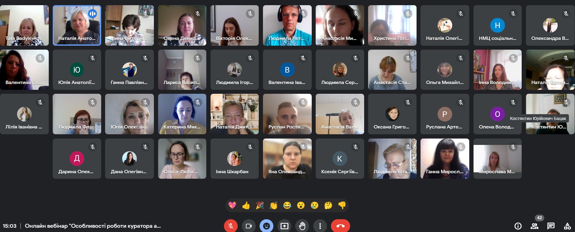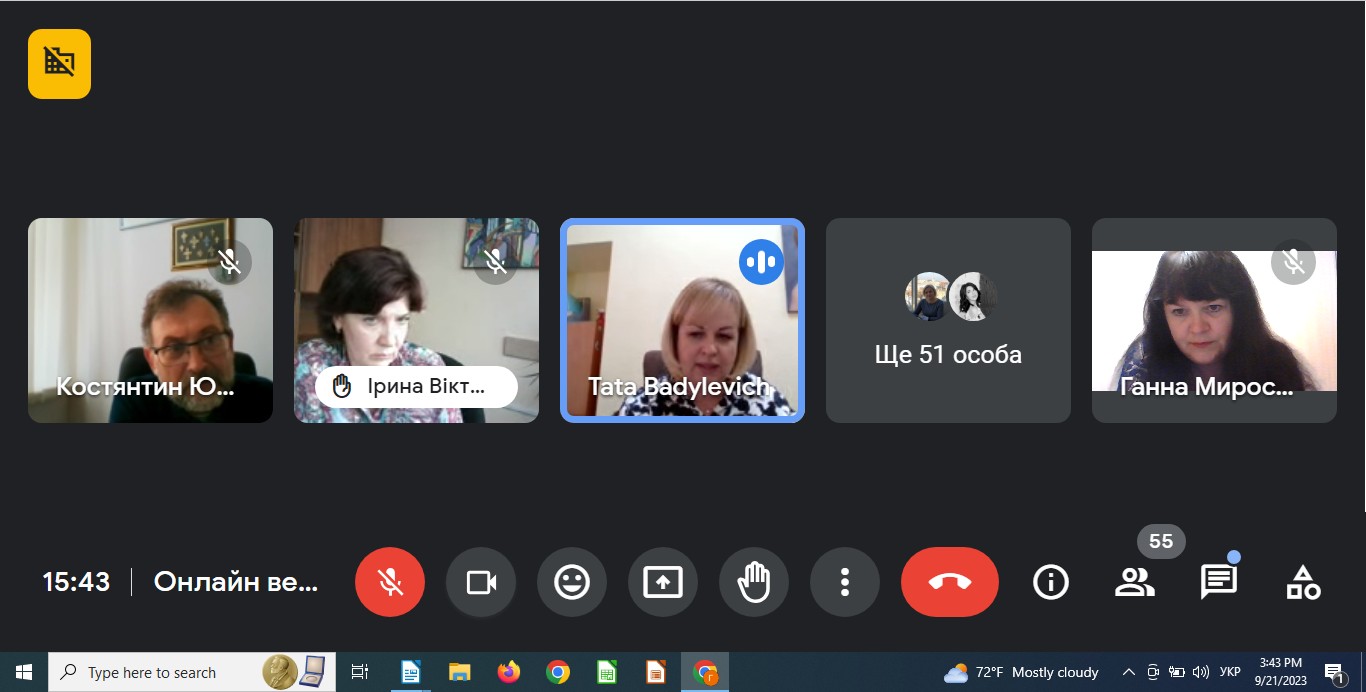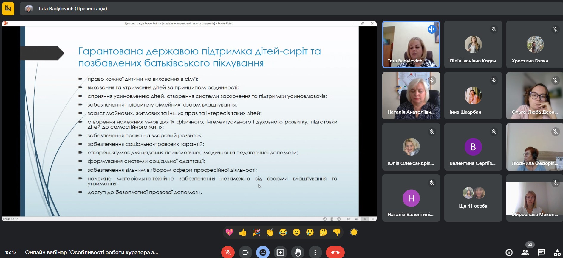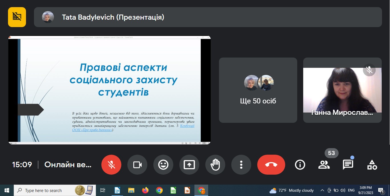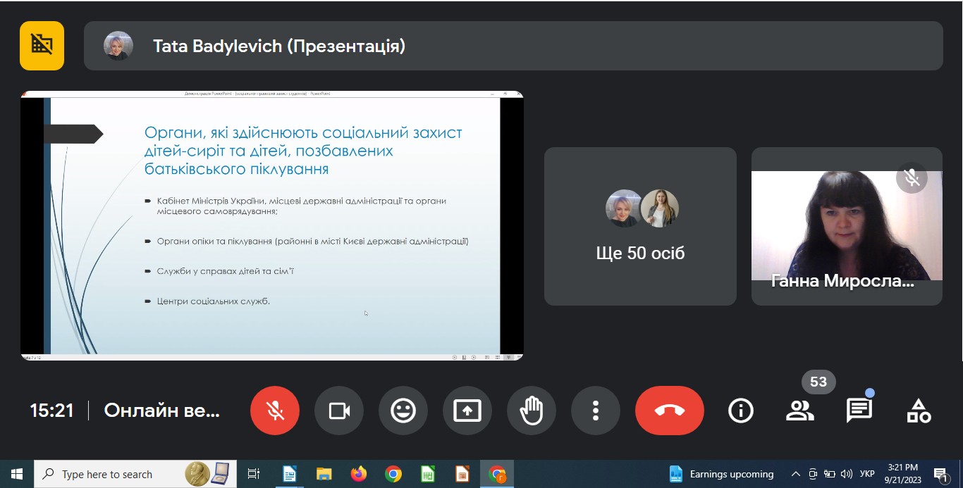 21 вересня 2023 р. доценти кафедри міжнародних відносин Ганна Мельник та Мирослава Лісовська у рамках “Школи кураторів” відвідали вебінар "Особливості роботи куратора академічної групи з соціально незахищеними категоріями студентів в закладах вищої освіти", який відбувся онлайн на платформі Google Meet.