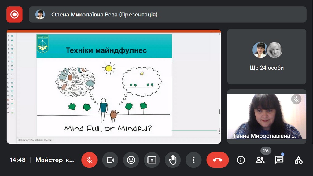 Олена Рева , доцент кафедри психології особистості та соціальних практик Факультету психології, соціальної роботи та спеціальної освіти провела тренінг для викладачів щодо практик самозбереження в умовах війни, ознайомила присутніх з практиками оптимізації власного ресурсу за великого психологічного навантаження в умовах воєнного часу, відпрацювала з присутніми технології психологічної підтримки та стабілізації свого емоційного стану.