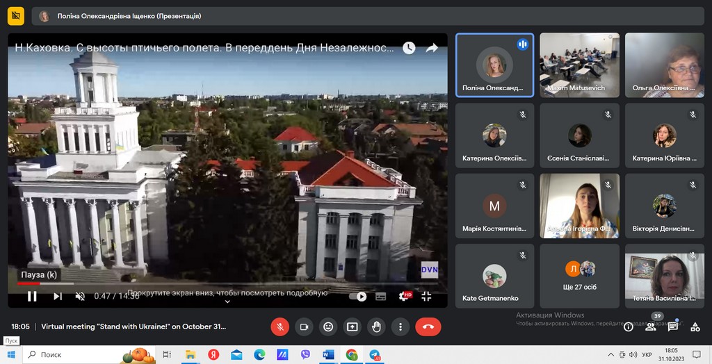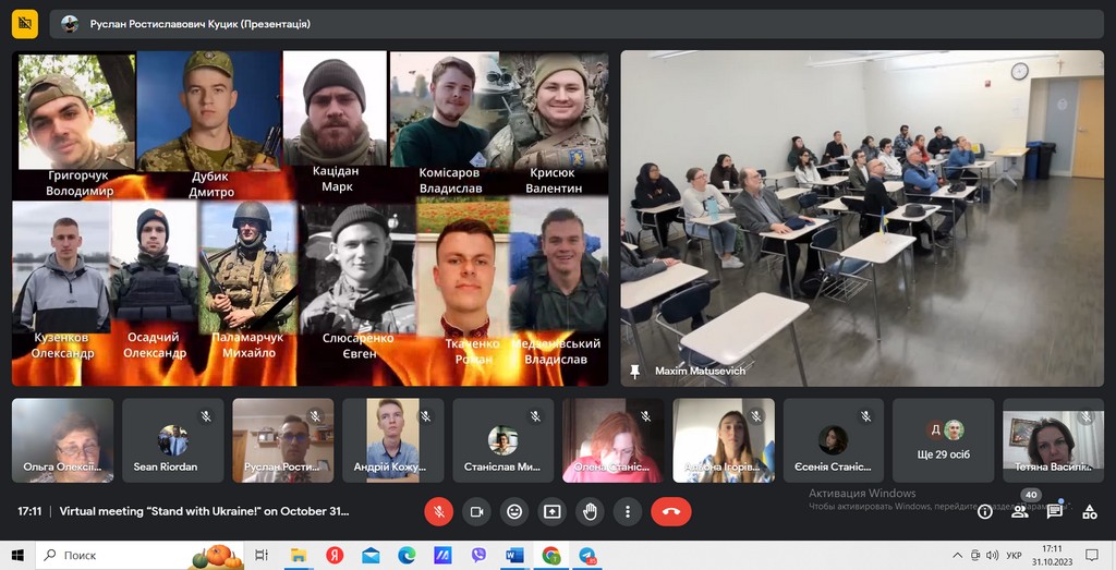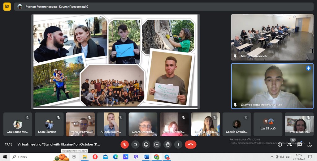 31 жовтня 2023 року студенти освітніх програм “Суспільні комунікації” та “Регіональні студії” першого (бакалаврського) та другого (магістерського) рівнів Факультету права та міжнародних відносин взяли участь у віртуальній зустрічі з американськими студентами на тему: «Stand with Ukraine! Досвід виживання українських студентів під час російсько-української війни (2014-2023…)». Зустріч було організовано кафедрою історії України Факультету суспільно-гуманітарних наук КУБГ в рамках міжуніверситетської співпраці із католицьким університетом Сетон Хол (штат Нью-Джерсі, США).