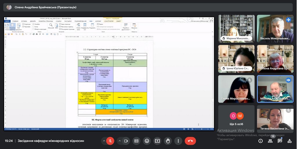 16 квітня 2024 р. відбулось засідання кафедри під час якого робочі групи представили зміни внесені в освітньо-професійні програми на основі, отриманих пропозицій протягом 2021-2023 рр., які надійшли шляхом анкетування та опитування стейкхолдерів. Науково-педагогічні працівники кафедри міжнародних відносин також висловили свої думки про вдосконалення освітньо-професійних програм.