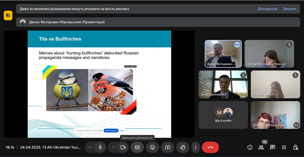 Презентуючи здобутки молодих вчених Денис Юрковський виступив з доповіддю «Українські меми як засіб формування національної стійкості», в якій розкрив роль мемів часів російсько-української війни як засобу психологічної розрядки та протидії ворожій пропаганді.