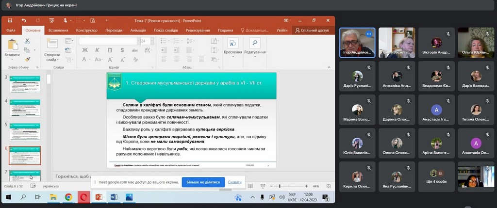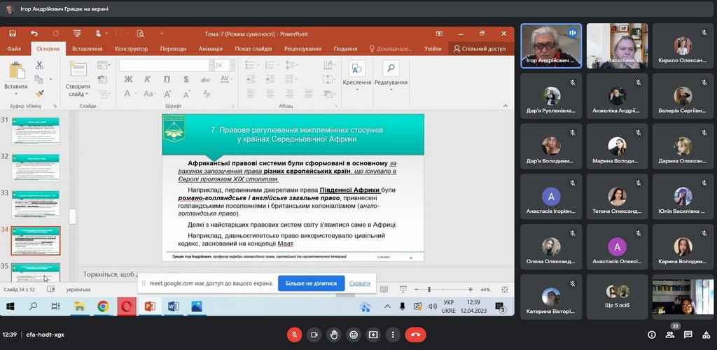 12 квітня 2023 року в рамках конкурсу на заміщення вакантних посад кафедри міжнародного права, європейської та євроатлантичної інтеграції відбулася відкрита (конкурсна) відеолекція професора кафедри міжнародного права, європейської та євроатлантичної інтеграції, кандидата юридичних наук, доктора наук з державного управління, професора, заслуженого діяча науки і техніки України Ігоря Андрійовича Грицяка для студентів І курсу спеціальності «Міжнародне право» (групи МПб-1-22-4.0д) з навчальної дисципліни «Історія міжнародного права» на тему «Формування норм міжнародного права на Арабському Сході, в країнах Африки та Америки» (змістовий модуль 2. «Міжнародне право в епоху Середньовіччя»). Лекція відбулася за навчальним розкладом академічної групи.
