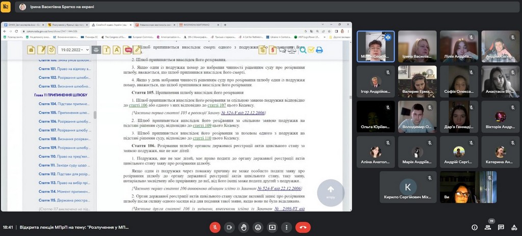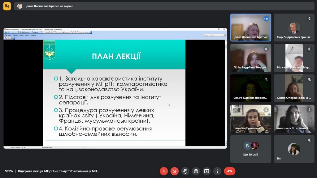 12 квітня 2023 року в рамках конкурсу на заміщення вакантних посад кафедри міжнародного права, європейської та євроатлантичної інтеграції відбулася відкрита (конкурсна) відеолекція завідуючої кафедрою міжнародного права, європейської та євроатлантичної інтеграції, кандидата юридичних наук, доцента Ірини Василівни Братко для студентів ІІІ курсу спеціальності «Міжнародне право» (групи МПб-1-20-4.0д) з навчальної дисципліни «Міжнародне приватне право: Особлива частина» на тему «Розлучення у міжнародному приватному праві». Лекція відбулася за навчальним розкладом академічної групи.