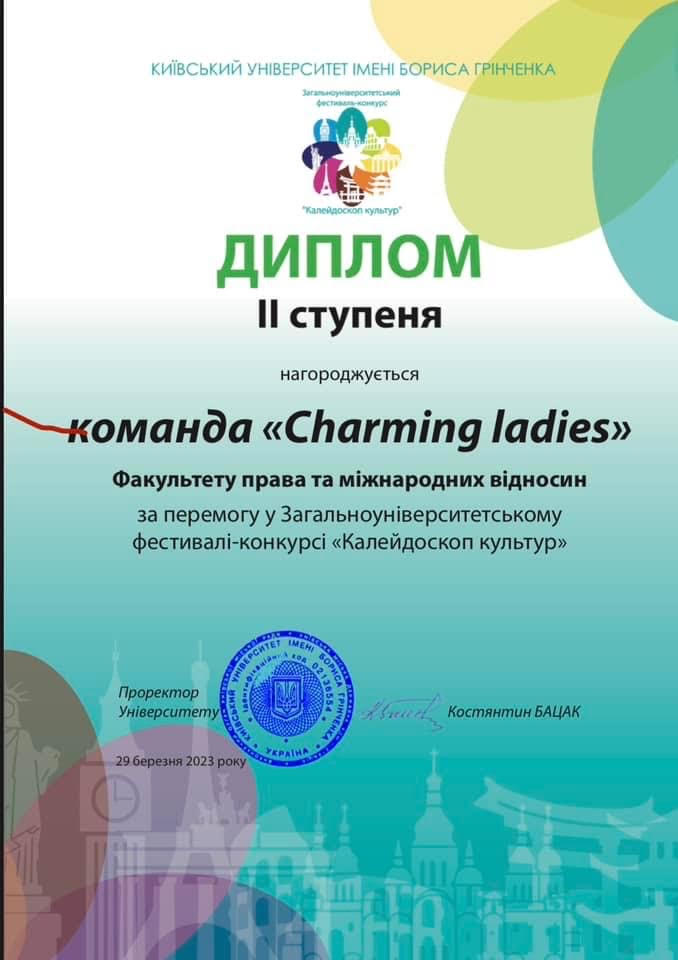 31 березня 2023 року ми щиро вітаємо команду "Charming ladies" та, зокрема студентку 1 курсу спеціальності «Міжнародне право» Софію Бобровську, зі срібною перемогою (Диплом ІІ ступеня) у традиційному загальноуніверситетському фестивалі-конкурсі "Калейдоскоп культур"!