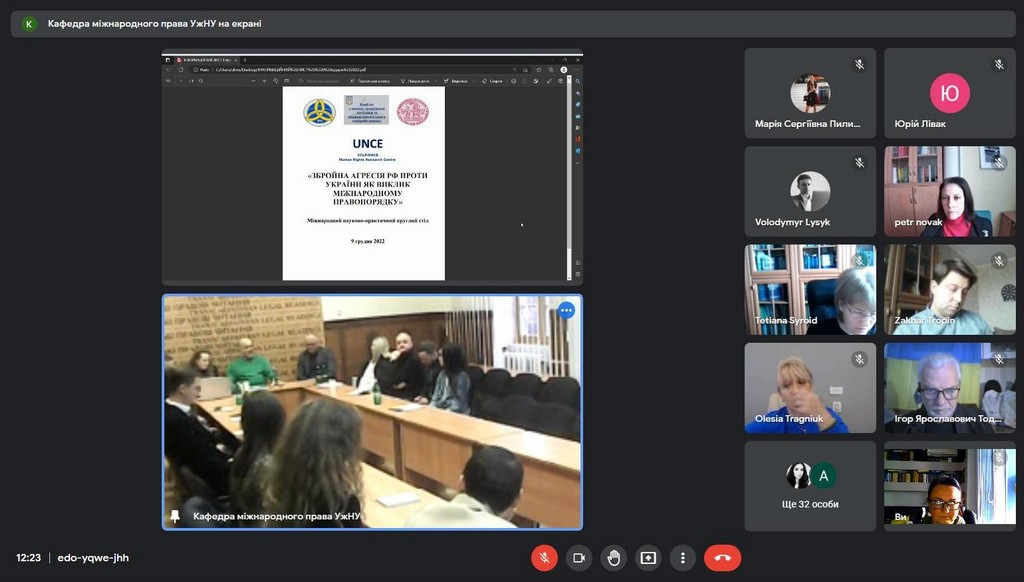 9 грудня 2022 року студенти 4 року навчання ОП «Міжнародне право» отримали можливість долучитися до роботи Міжнародного науково-практичного круглого столу «Збройна агресія РФ проти України як виклик міжнародному правопорядку». Це стало можливим завдяки кандидату юридичних наук, старшому науковому співробітнику, доценту кафедри Інні Ворошиловій та її колегам з кафедри міжнародного права Юридичного факультету Ужгородського національного університету. Участь у заході також взяла старший викладач кафедри Оксана Каспрук.