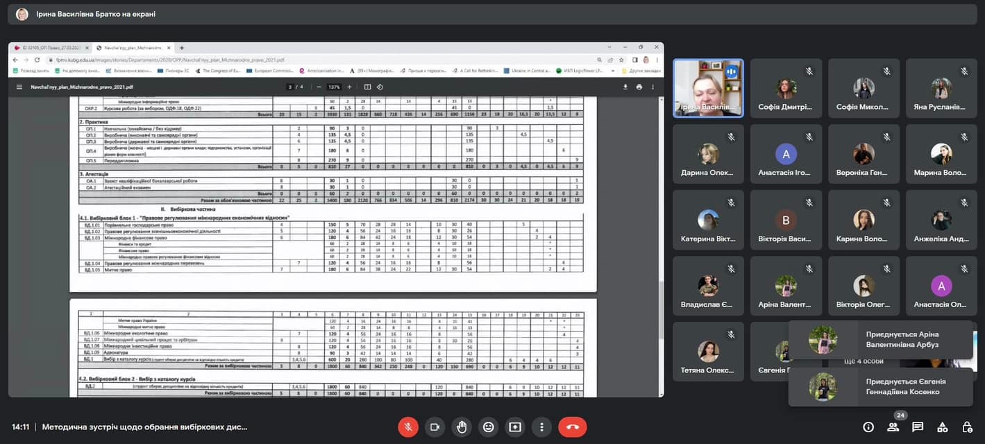 31 березня 2023 року відбулася методична зустріч завідуючої кафедрою Ірини Братко та куратора академічної групи доцента кафедри Інни Ворошилової зі студентами 1 курсу спеціальності «Міжнародне право» з приводу обрання вибіркових дисциплін. Студенти отримали інформацію про процедуру вибору і обрання дисциплін із каталогу вибіркових дисциплін, рекомендації та консультацію щодо наявних у каталозі дисциплін, зокрема, блоків фахових курсів, що пропонуються кафедрою міжнародного права, європейської та євроатлантичної інтеграції, а також інших курсів, що містяться у каталозі дисциплін, обговорили важливість зваженого вибору та значення дисциплін, що мають бути обрані, для подальшого навчання та поглиблення й розширення відповідних професійних компетентностей майбутніх юристів-міжнародників.