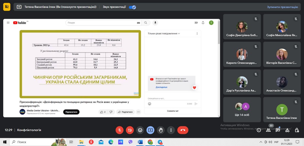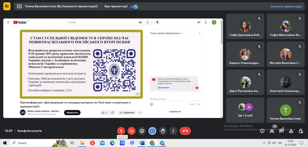 Для кращого засвоєння загальних компетентностей дисципліни, студентам було корисно ознайомитися із психологічними аспектами впливу, етапами впровадження у суспільну свідомість цієї агресивної пропаганди та про війну, як крайній тип соціальної взаємодії. Соціальна психолог фахово розповіла про психологічні «розломи» в українському суспільстві, ризики і загрози їх використання росією. Спікери наголосили на необхідності розвитку критичного мислення, медіаграмотності, політичного лідерства – як методів протидії суспільному роз’єднанню. А також цікаво висвітлили настрої російського суспільства щодо українців, наявні внутрішні «розломи» та можливі наслідки конструкту злоякісної пропаганди росії на її власне населення.