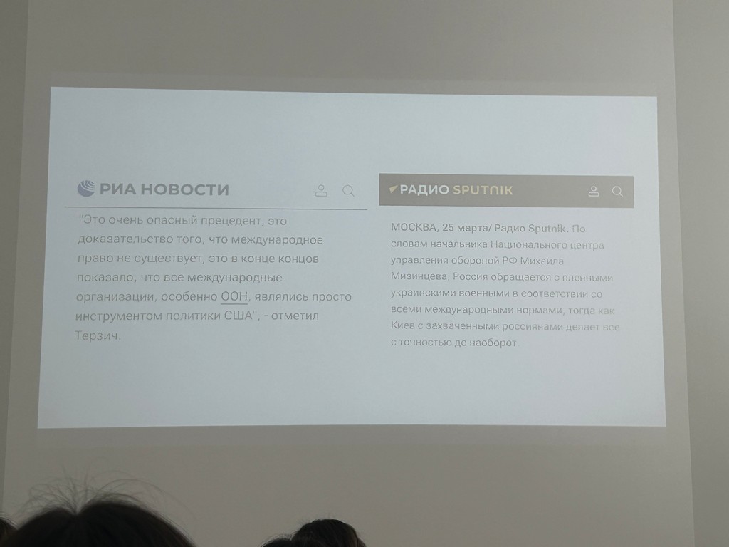 Спікерами виступили двоє фахівців у галузі міжнародного гуманітарного права - Дмитро Кириченко, Офіцер із захисту емблеми Червоного Хреста в Українському товаристві Червоного Хреста, тренер з міжнародного гуманітарного права та Альбіна Басиста, кандидатка юридичних наук, юристка-міжнародниця, фахівчиня з міжнародного гуманітарного права з багаторічним досвідом викладання цієї дисципліни у закладах вищої освіти, тренера з МГП в рамках Центру підвищення кваліфікації Дослідницької служби Верховної Ради України (колишнього Інституту законодавства Верховної Ради України).