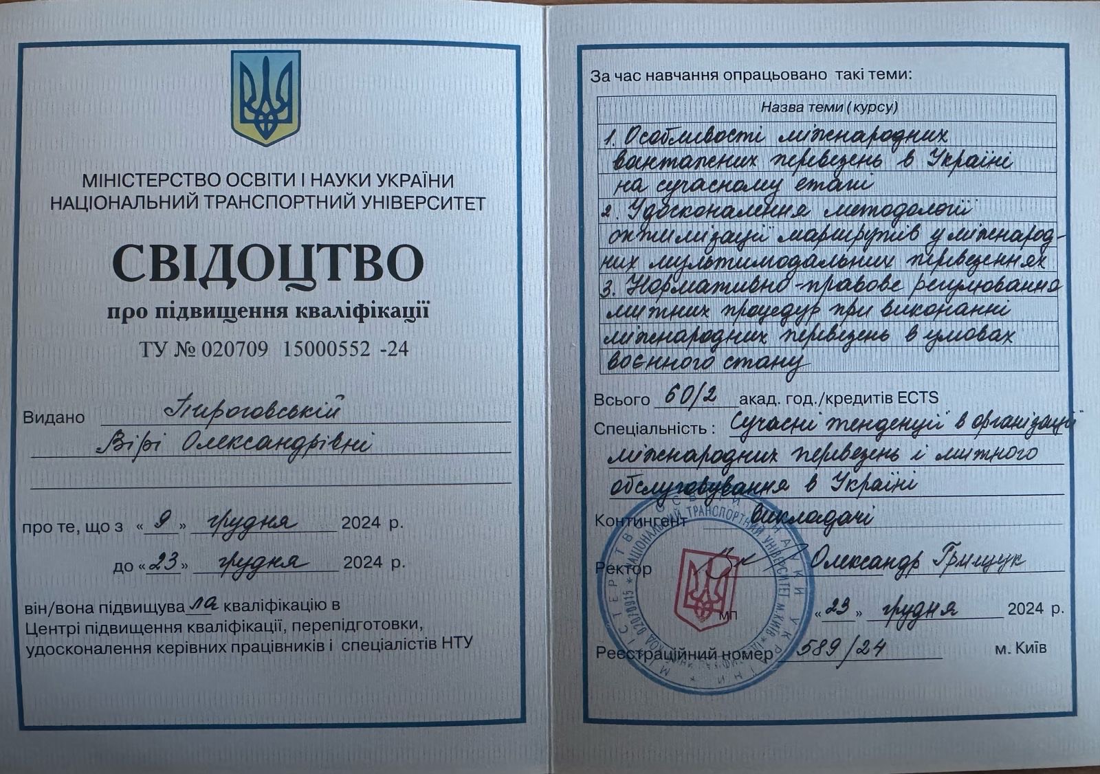 З 09 по 23 грудня 2024 року доцент кафедри міжнародного права, європейської та євроатлантичної інтеграції, кандидат юридичних наук Віра Пироговська успішно пройшла навчання на курсі з підвищення кваліфікації за тему «Сучасні тенденції в організації міжнародних перевезень і митного обслуговування в Україні». Курс підвищення кваліфікації було організовано на базі Національного транспортного університету.