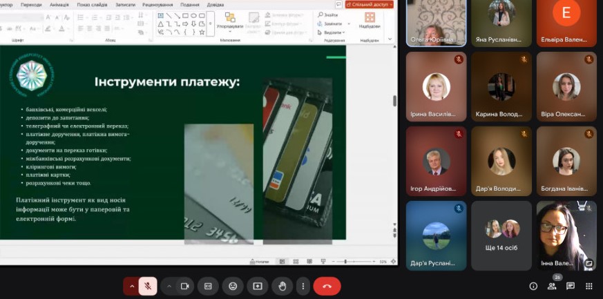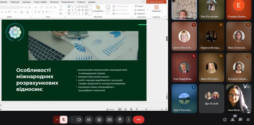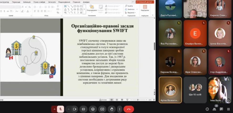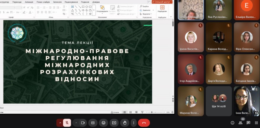 Ольга Шереметьєва провела лекцію на тему «Міжнародно-правове регулювання міжнародних розрахункових відносин» для студентів 3 курсу спеціальності «Міжнародне право» (група МПб-1-22-4.0д) у рамках дисципліни «Міжнародне фінансове право. Змістовий модуль: «Міжнародно-правове регулювання фінансових відносин». Лекція пройшла в дистанційному форматі.
