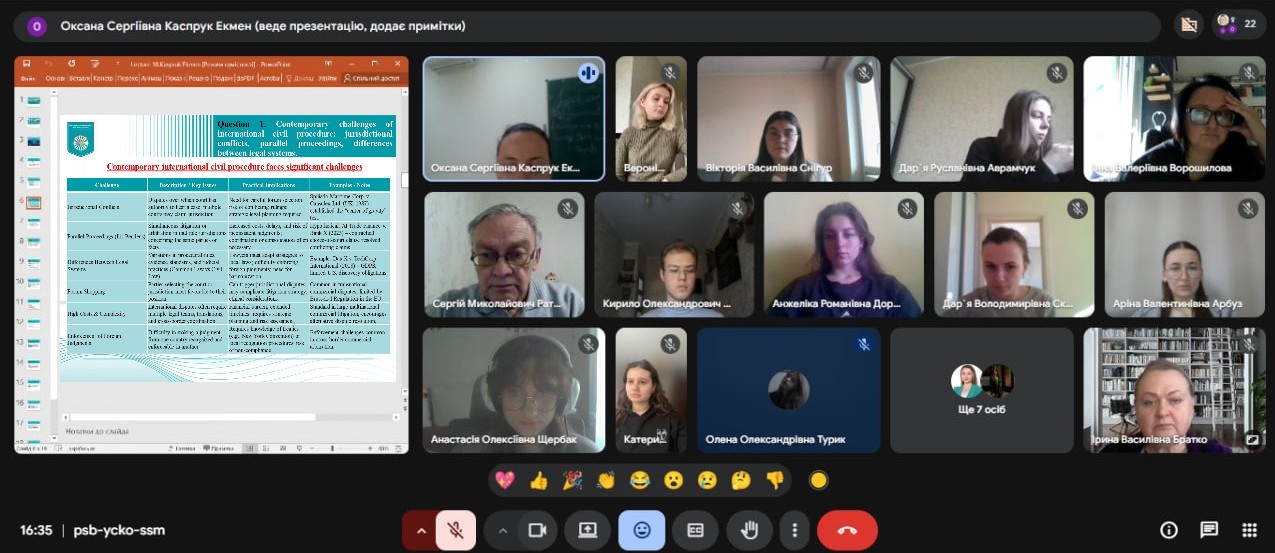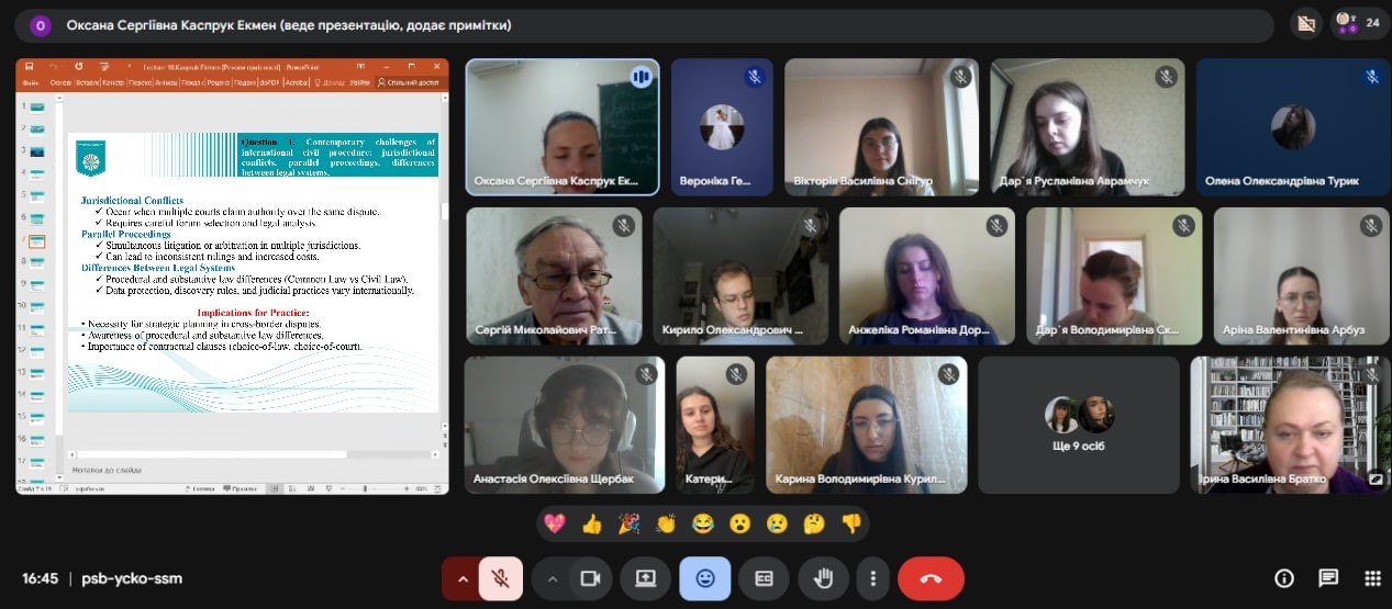 31 березня 2026 р. доцент кафедри міжнародного права, європейської та євроатлантичної інтеграції, к.ю.н., Оксана Сергіївна Каспрук Екмен провела відкриту лекцію англійською мовою з дисципліни «Міжнародний цивільний процес та арбітраж» для студентів спеціальності 293 Міжнародне право англійською мовою на тему «International Civil Procedure and Arbitration: Current Trends and Future Prospects». Лекторка прочитала цікаву та змістовну лекцію, активно спілкувалась з студентами, представила різноманітні презентаційні матеріали, спиралась на практичний досвід та наукові дослідження за цією тематикою. Оксана Сергіївна продемонструвала високій рівень педагогічної майстерності та творчій підхід до проведення лекційних занять.