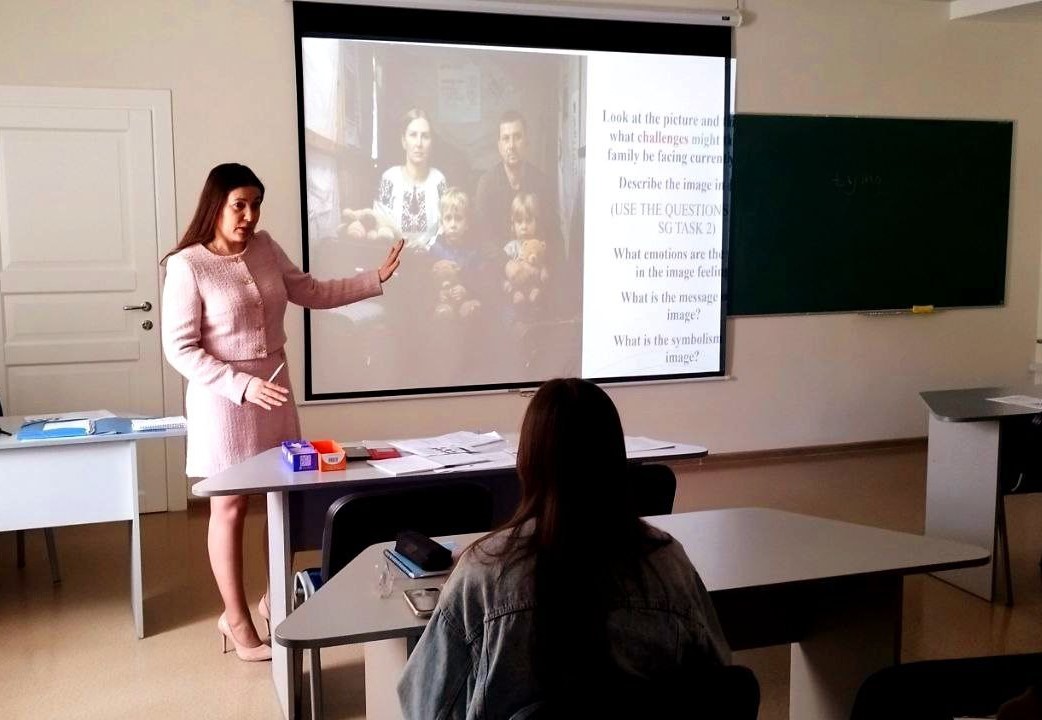Старший викладач Гурина Н.В. під час опрацювання теми «Family issues. Migration. Shaping national identity values» показала зразок інтерактивного цікавого надзвичайно пізнавального заняття на тему, раціонально і творчо використовуючи різноманітні методи навчання та різноманітні форми навчального матеріалу (картинки, відео, картки, hand outs, mind maps). На занятті піднімались та обговорювались надскладні теми психологічних та фізичних труднощів, емоційних втрат , з якими стикаються українськи сім’ї та особливо діти під час війни. Обговорювалась тема ідентичності української сім’ї та міжнародна допомога нашім дітям-біженцям міжнародною організацією UNICEF. Прекрасне володіння предметом, методикою викладання і аудиторією, творчій підхід до поступового і дуже вдалого введення лексичного та граматичного матеріалу по темі дозволило викладачу створити неповторну творчу атмосферу, створення інтерактивного дискурсу заняття: наприклад, студентам було запропоновано описати фото сім’ї, дати всім ім’я, професії та ситуацію, в якій вони знаходяться в укриттях. Таким чином через емпатію, студенти самі стають частиною історії цієї сім’ї , не помічають, як вміло вводиться та закріплюється складний граматичний та лексичний матеріал Making assumptions , idioms in context, Cоnditionals та інші, а також як створюється перехід від конкретної лексики до складної і метафоричної. Студенти вправно оволоділи вивченим матеріалом, висловлювали свої думки та обговорювали проблемні питання.