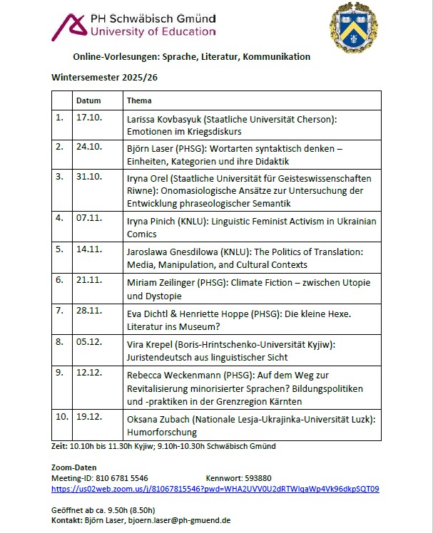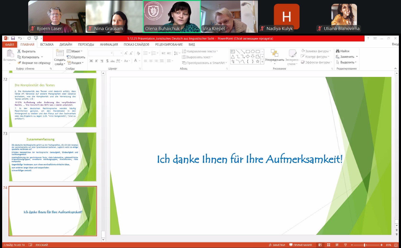 05 грудня 2025 року завідувач кафедри іноземних мов Факультету права та міжнародних відносин, кандидат філологічних наук, доцент Віра Крепель в рамках участі у міжнародному освітньо-науковому проєкті, організованому Педагогічним інститутом Швебіш Гмюнд (Німеччина) на базі Київського національного лінгвістичного університету виступила з науковою доповіддю на тему «Німецька юридична мова з точки зору лінгвістики». Німецько-український освітньо-науковий проєкт започатковано у 2022 році, він має на меті підвищення кваліфікації германістів України, учасниками семінару є викладачі німецької, а з весни 2024 року також і англійської мови. Тематика семінарів у форматі онлайн охоплює актуальні питання лінгвістики, дидактики, німецької літератури, прагматики, комунікативної лінгвістики, фахових мов, воєнного дискурсу, компаративістики, культурології, когнітивної лінгвістики та фразеології.