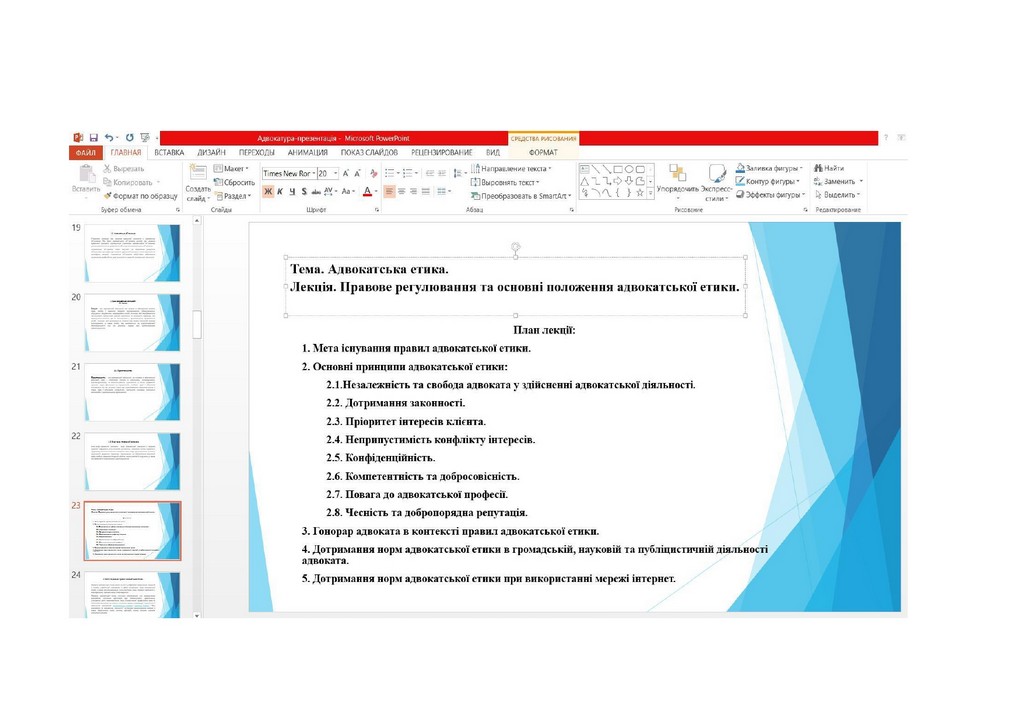 В ході лекції були висвітлені актуальні питання мети існування правил адвокатської етики; основних принципів адвокатської етики; гонорару адвоката в контексті правил адвокатської етики; дотримання норм адвокатської етики в громадській, науковій та публіцистичній діяльності адвоката; дотримання норм адвокатської етики при використанні мережі інтернет.