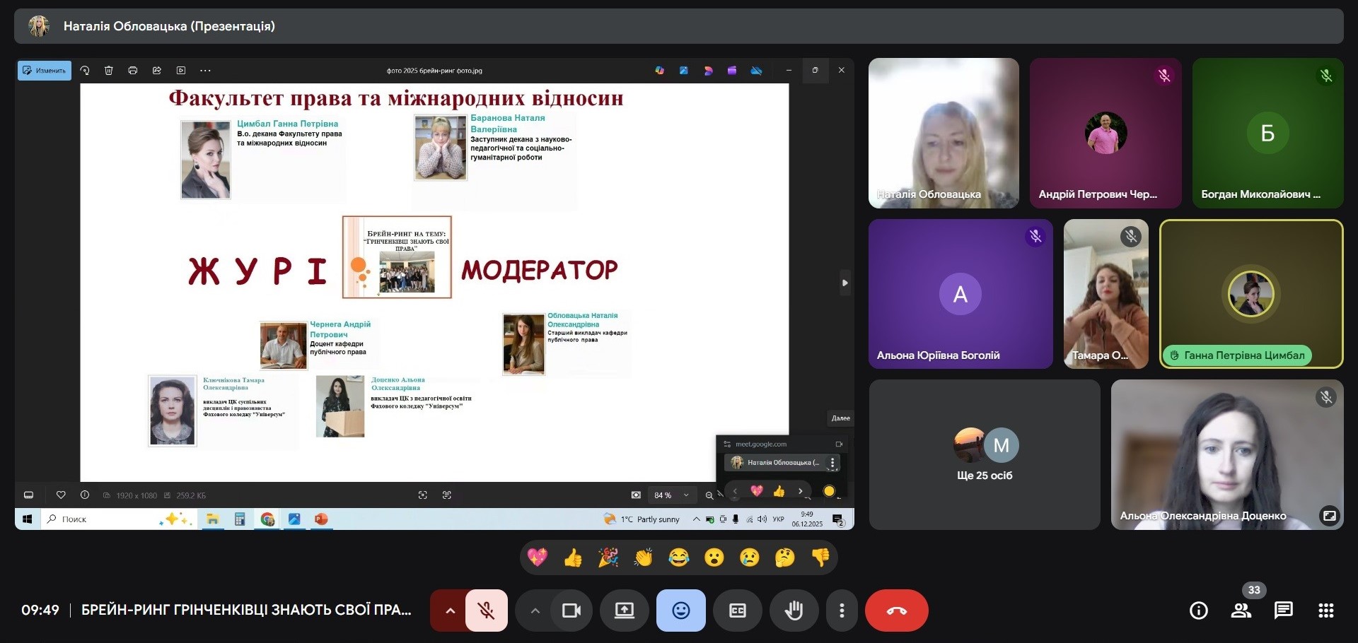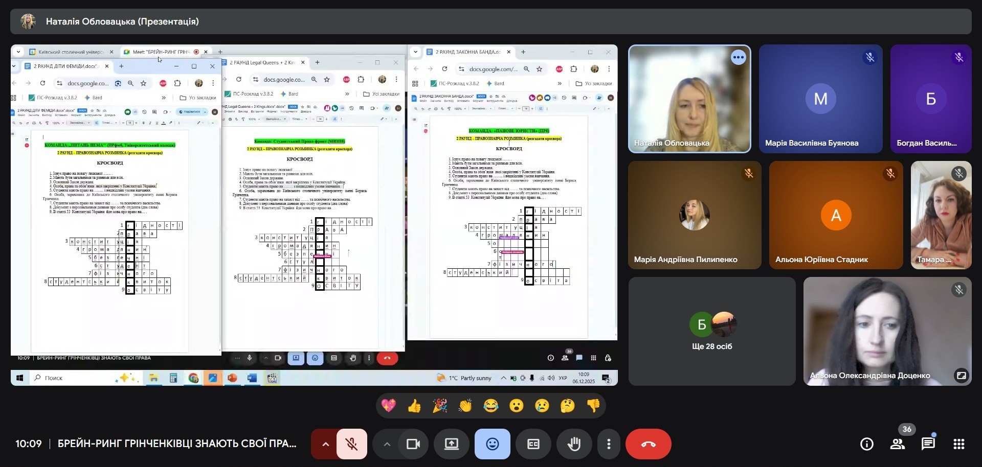 06 грудня 2025 року кафедра публічного права провела онлайн-захід, що став однією з яскравих подій Грінченківської декади – Брейн-ринг «Грінченківці знають свої права». У професійному змаганні зійшлися студенти спеціальностей «Право» та «Міжнародні відносини» Факультету права та міжнародних відносин разом із студентами Фахового коледжу «Універсум».